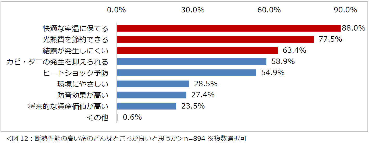 また、断熱性能を重視したいと回答した894名に「断熱性能の高い家のどんなところが良いと思いますか?」と尋ねたところ、1位は「快適な室温に保てる」(88.0%)でした。2位に「光熱費を節約できる」(77.5%)、3位に「結露が発生しにくい」(63.4%)が続きました(図12)。