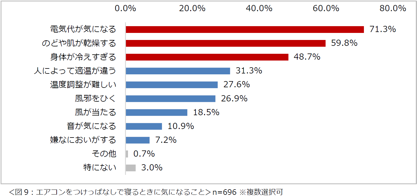 エアコンをつけっぱなしで寝ることがあると回答した696名に、「エアコンをつけっぱなしで寝るときに気になること」について尋ねたところ、「電気代が気になる」という回答が最も多く7割以上となりました。次いで、「のどや肌が乾燥する」(59.8%)、「身体が冷えすぎる」(48.7%)など、健康面での不調が気になるという回答が続きました(図9)。