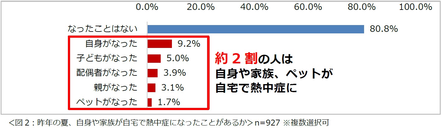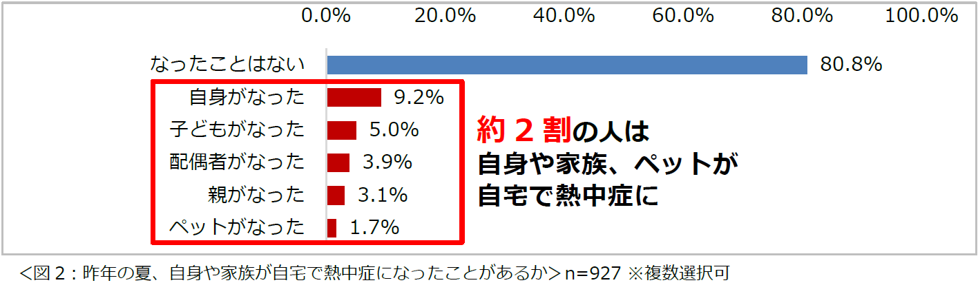 昨年の夏、自身や家族、ペットが自宅で熱中症になったことがある人は約2割。