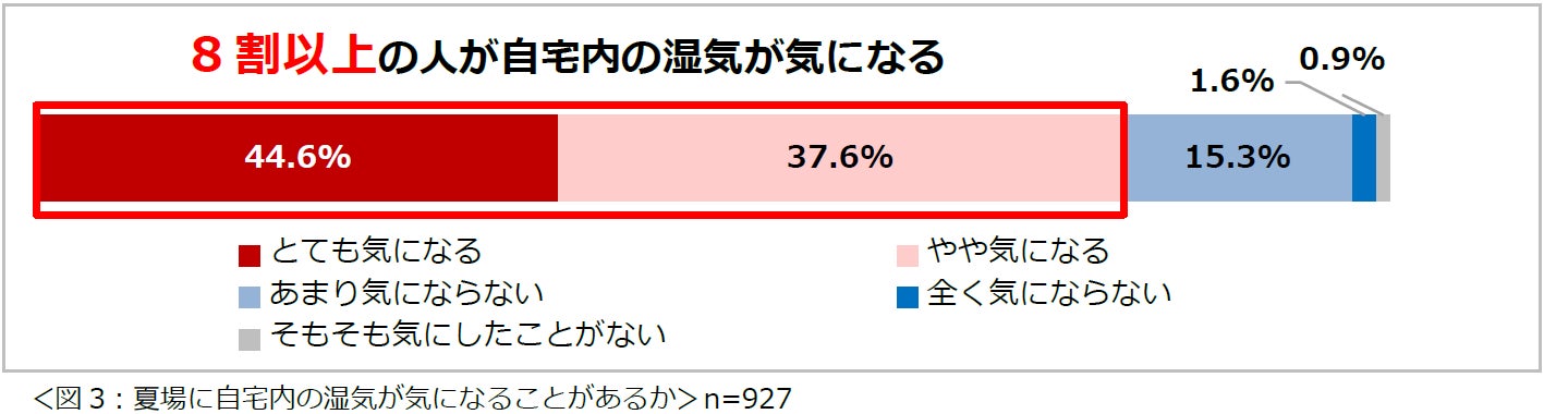 続いて「夏場、自宅内の湿気が気になることはありますか?」と尋ねたところ、「とても気になる」(44.6%)と答えた人が最も多く、「やや気になる」(37.6%)と回答した人を合わせると、8割以上の人が、夏場に自宅内の湿気を気にしていることが分かりました(図3)。
