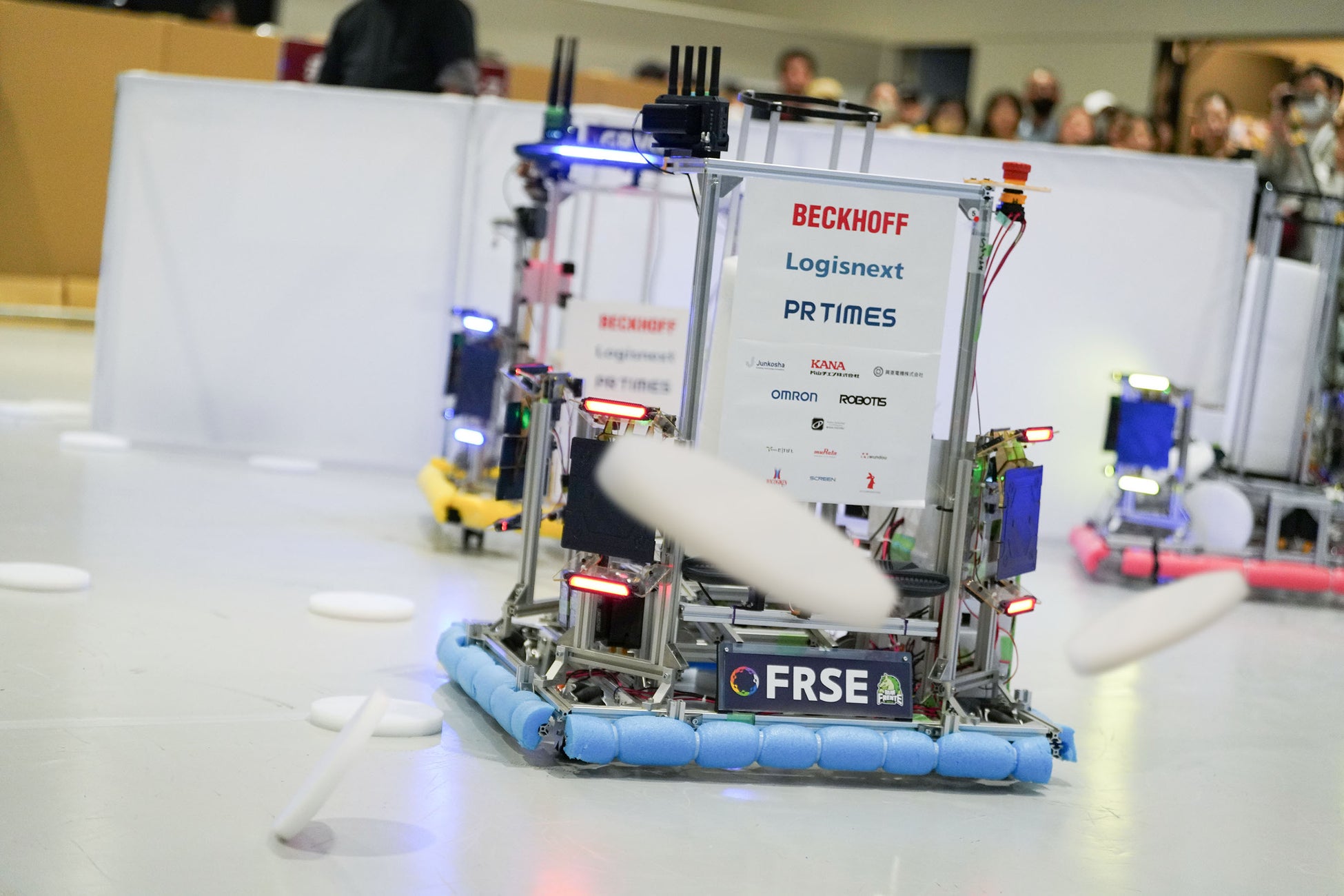 ロボット同士でフライングディスクを投げ合い、対戦相手のロボットに当てて点数を競います。ロボットは直接見ずに、ロボットの視点の映像を見て操縦します。