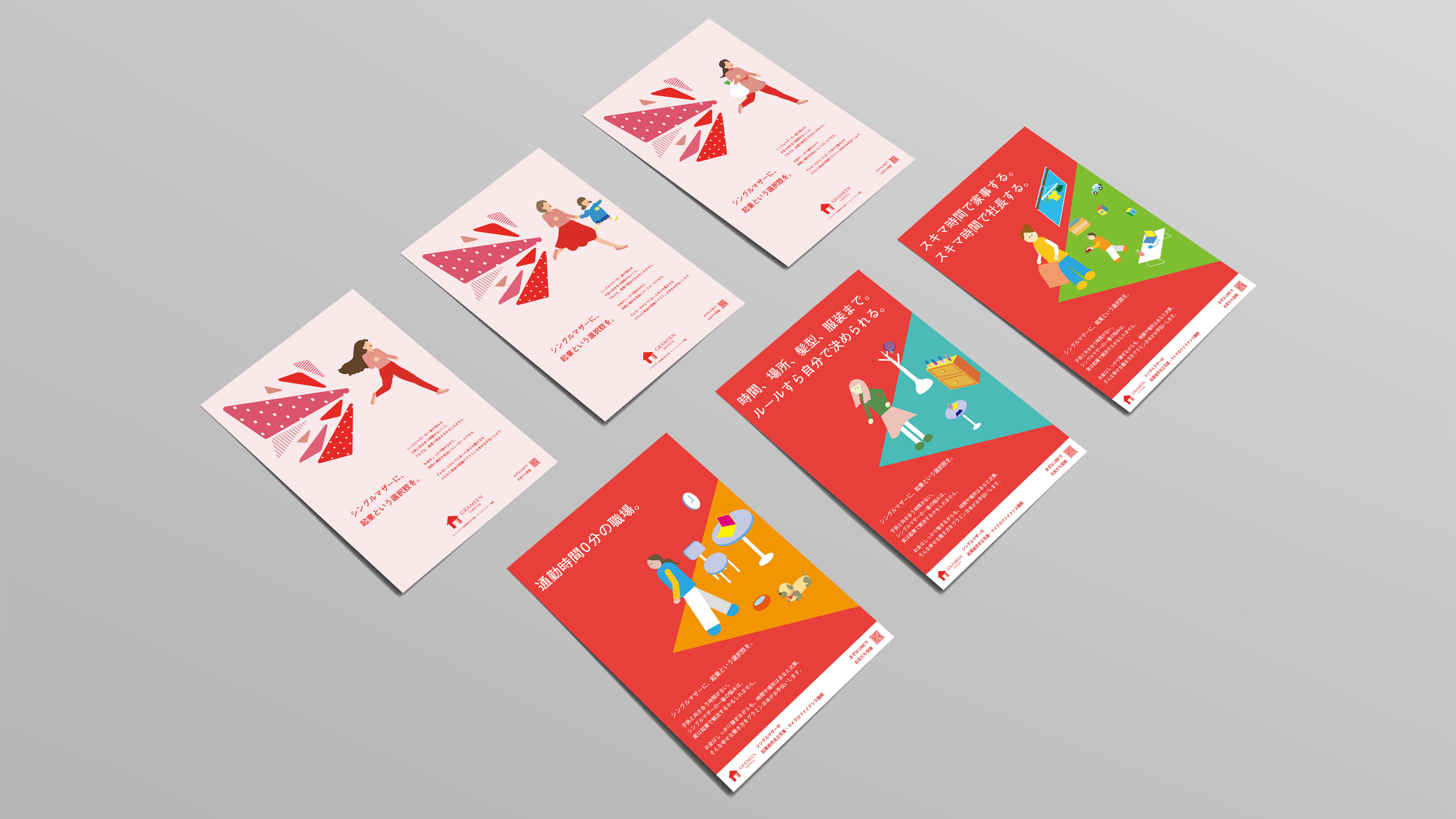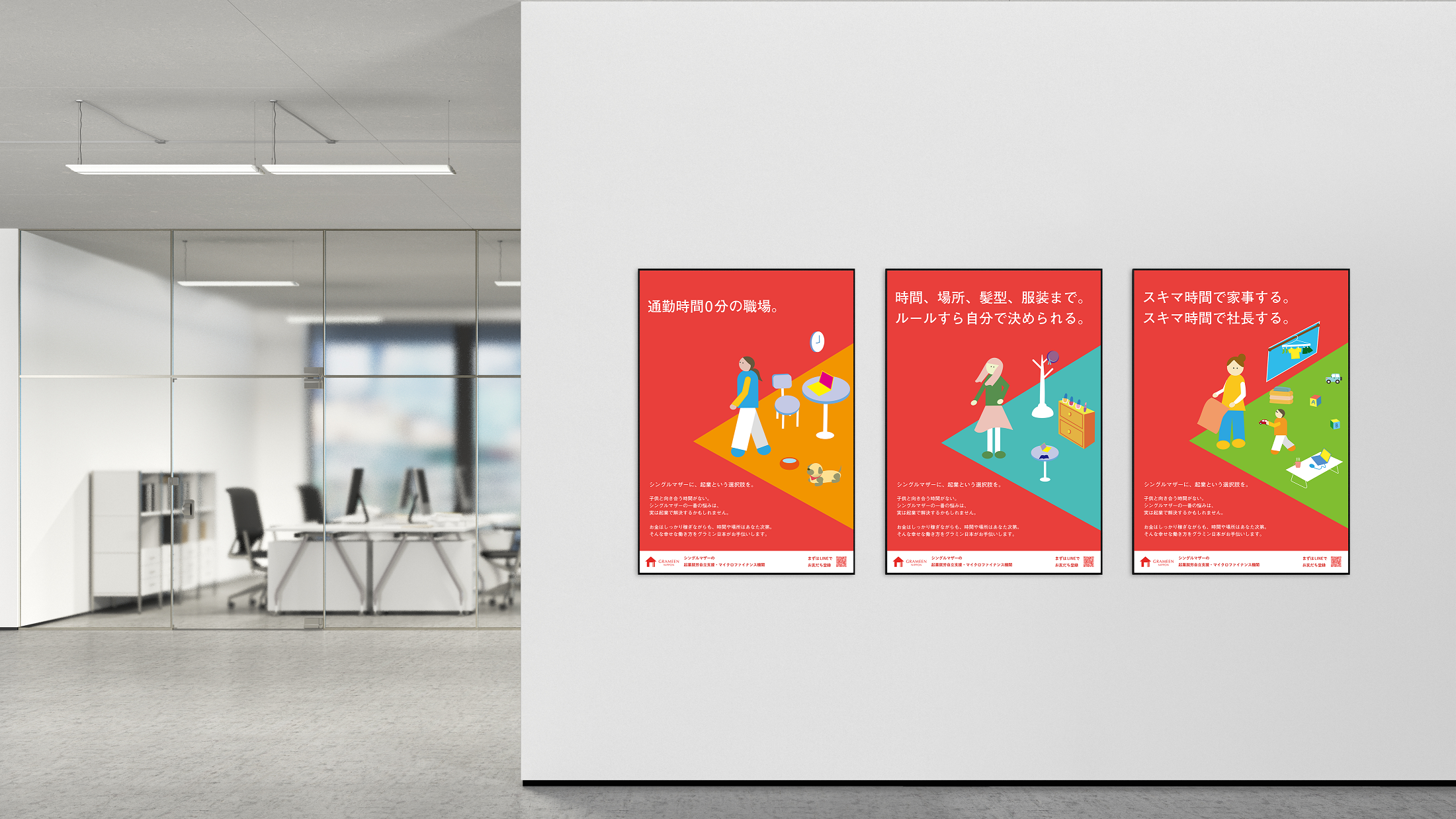 三角のモチーフは、シングルマザーの進む道を示し、新たなキャリアを前向きに進んでいくことを表現しています。また、複数のイラストは、自分らしく新しい道を前向きに走っていくイメージで制作しました。走る女性だけではなく、子どもを連れている女性、買い物をしている女性な、具体的なイメージも含めたパターンを描いています。