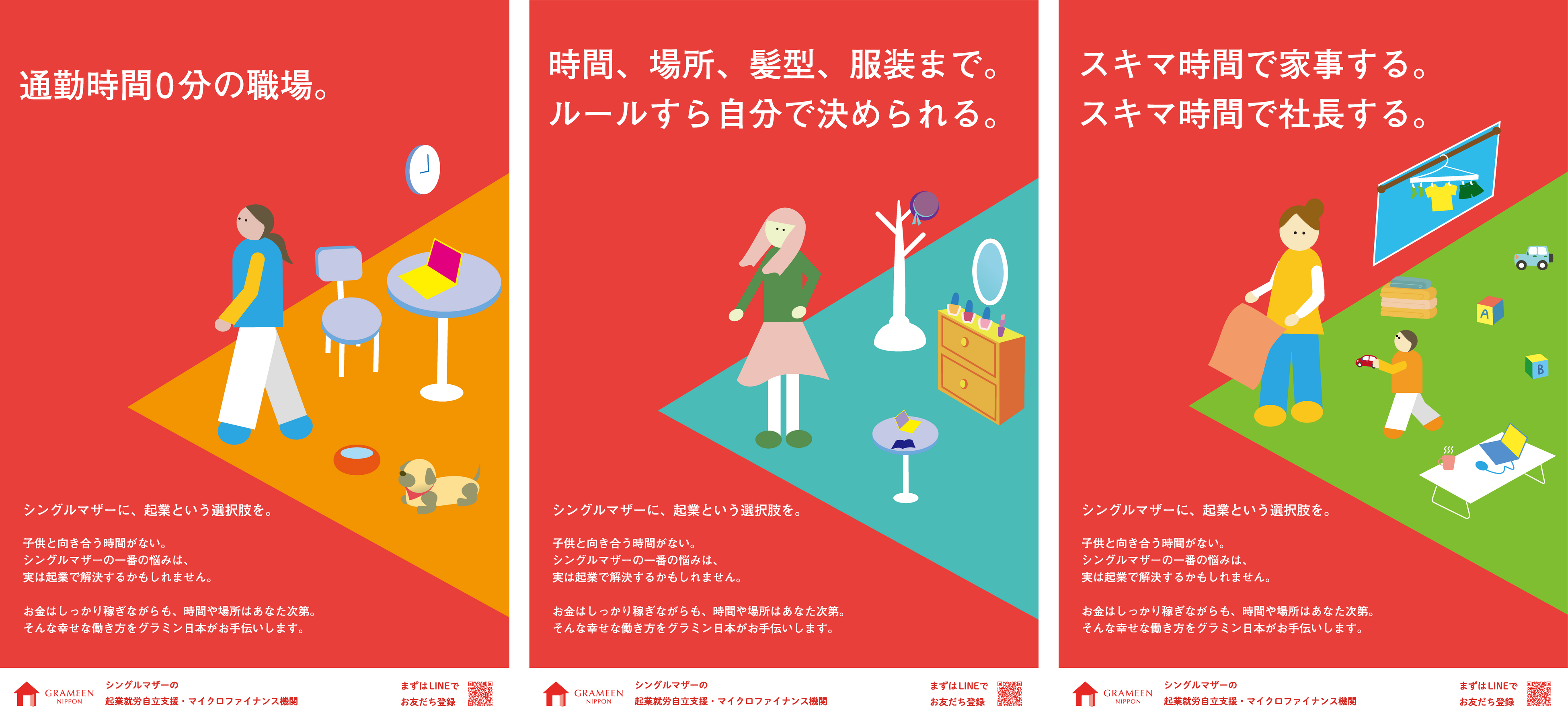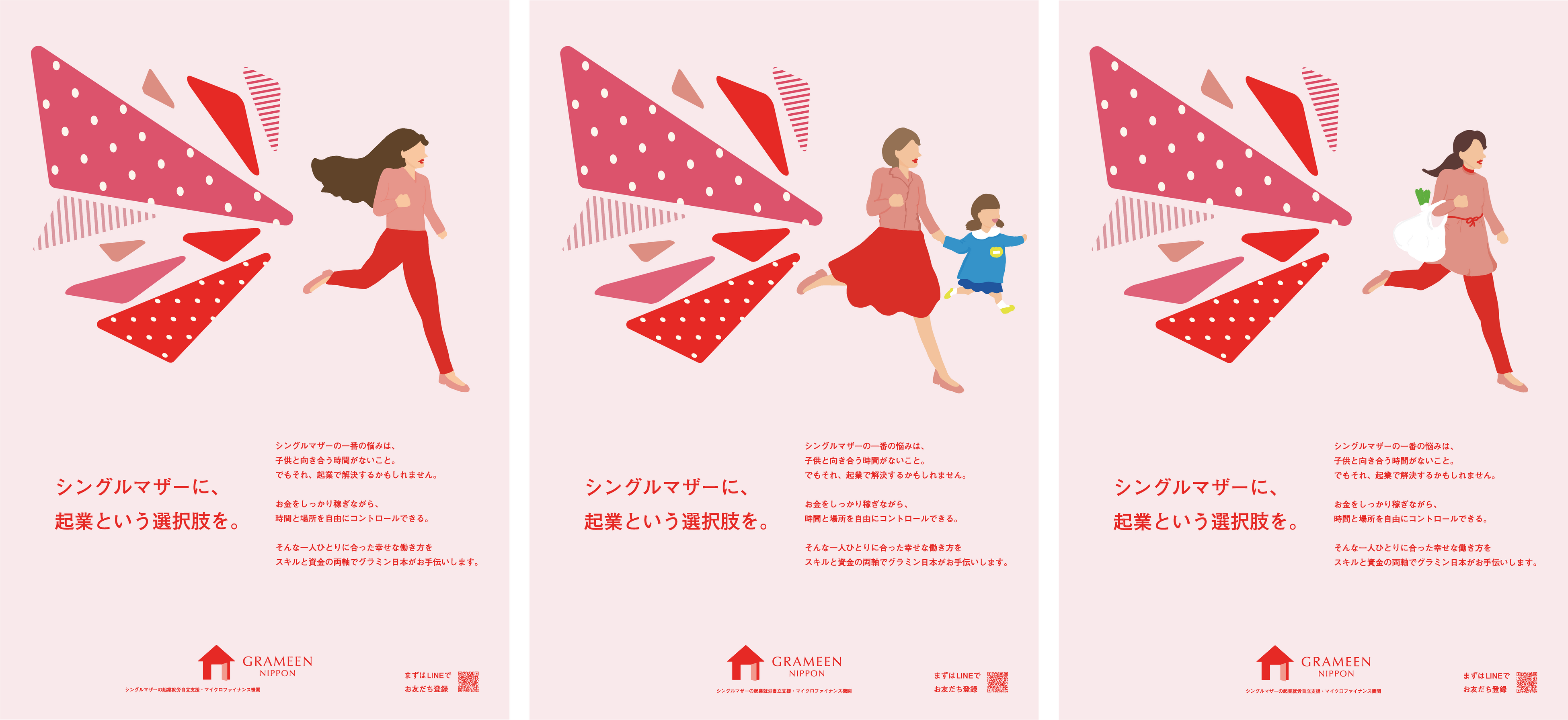 ブランドメッセージと合わせて、ブランドビジュアルも発表します。全6種類となるグラフィックを、グラミン日本オフィスや、サポート企業様へポスター配布(A・B、お好きなビジュアルを配布致します。)をはじめ、オフィシャルSNSや各種メディア、シングルマザーの支援を対象としたワークショップ会場等、幅広い場所にて新しいメッセージ・ビジュアルを露出していきます。