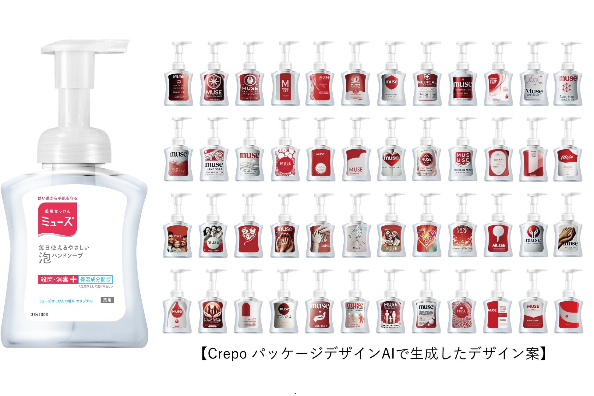 デザインとリサーチとAIで商品企画をリードする株式会社プラグ(本社:東京都千代田区、代表取締役社長:小川 亮)は、商品デザインを生成する『CrepoパッケージデザインAI』を提供しています(以下、本AI)。この度、レキットベンキーザー・ジャパン株式会社(本社:東京都品川区東五反田、代表取締役:スチュアート・ウィザビー)の『薬用せっけんミューズ泡ハンドソープ』のリニューアル(26年4月上旬から順次切り替え)に際し、本AIが活用されデザインが開発されました。