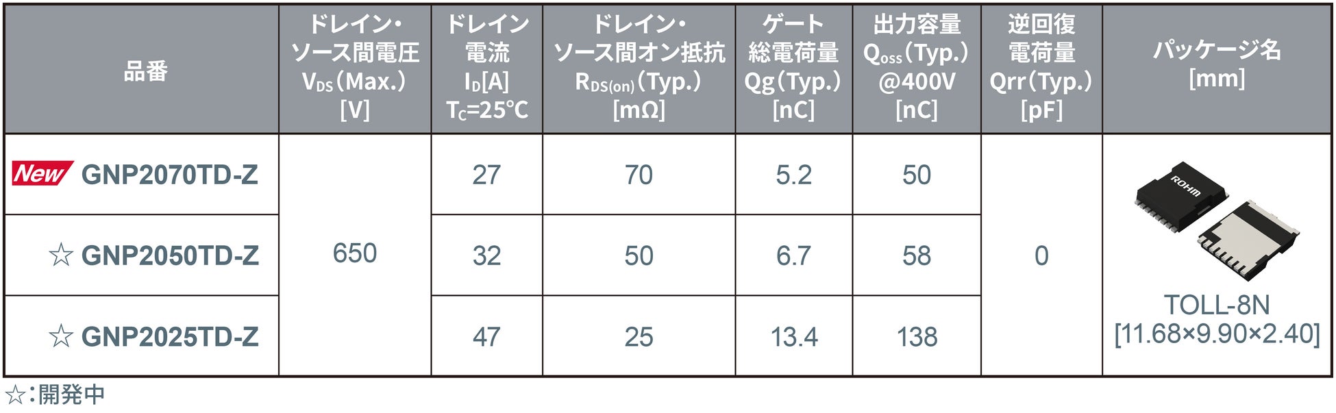 ロームは、2023年4月に、650V耐圧の第1世代GaN HEMTを量産し、2023年7月にはゲートドライバと650V耐圧GaN HEMTを1パッケージにしたパワーステージICを量産しました。そして今回、ハイパワーアプリケーションにおける、さらなる小型・高効率化の市場要求に対応するため、従来のDFN8080パッケージに追加する形で650V GaN HEMTのパッケージラインアップを強化。TOLLパッケージに第2世代の素子を搭載し、製品化しました。