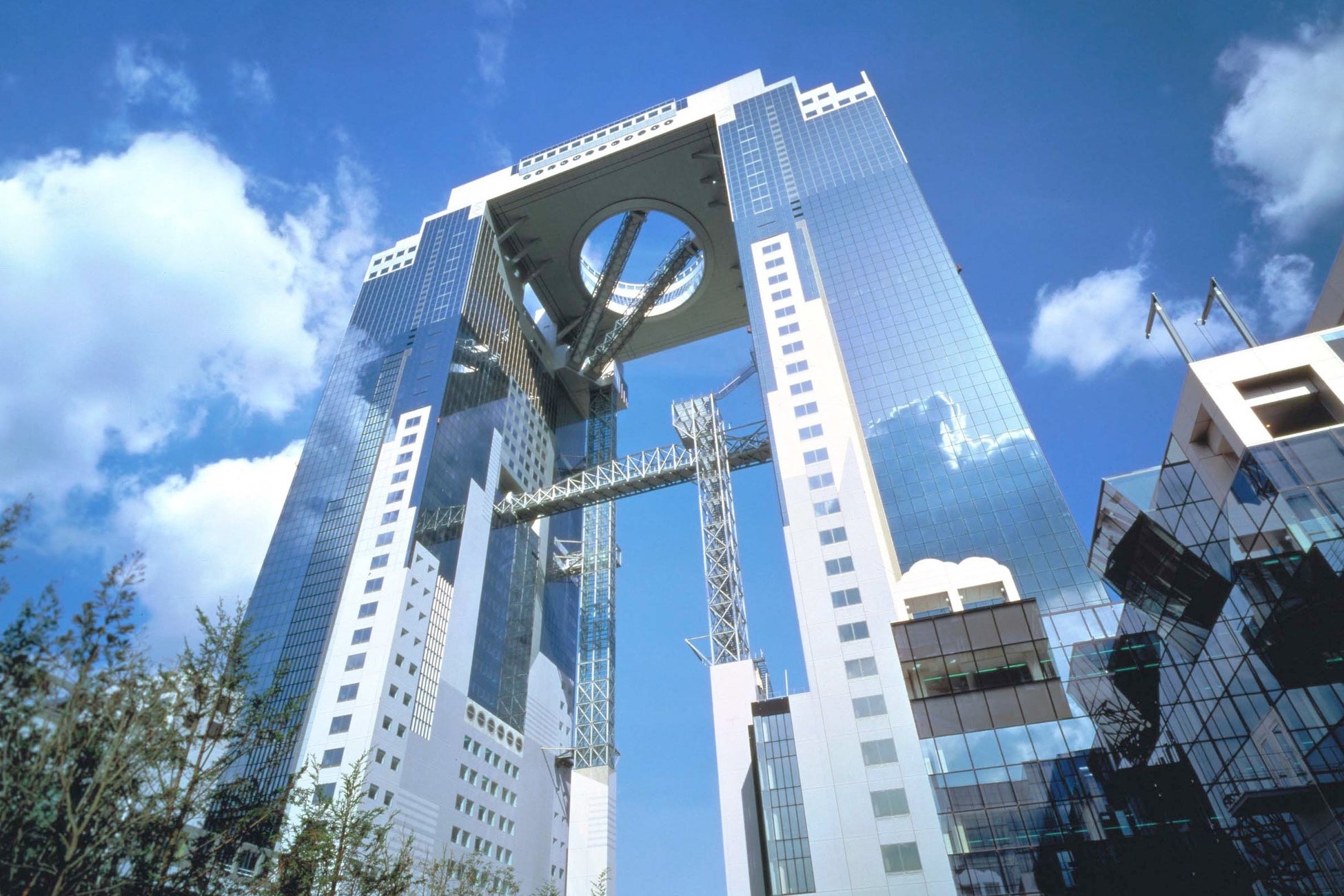 梅田スカイビルは、2つのビルが屋上を含む上層部「空中庭園」でつながる独特のフォルムの連結超高層ビル。