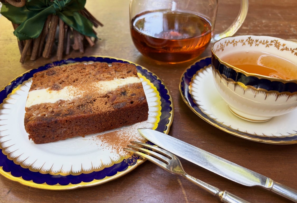 スパイスの効いた生地ににんじんやレーズン、クルミが入った、甘さ控えめなイギリスの伝統菓子。オーガニックティーを合わせてセットメニューでご提供しております。