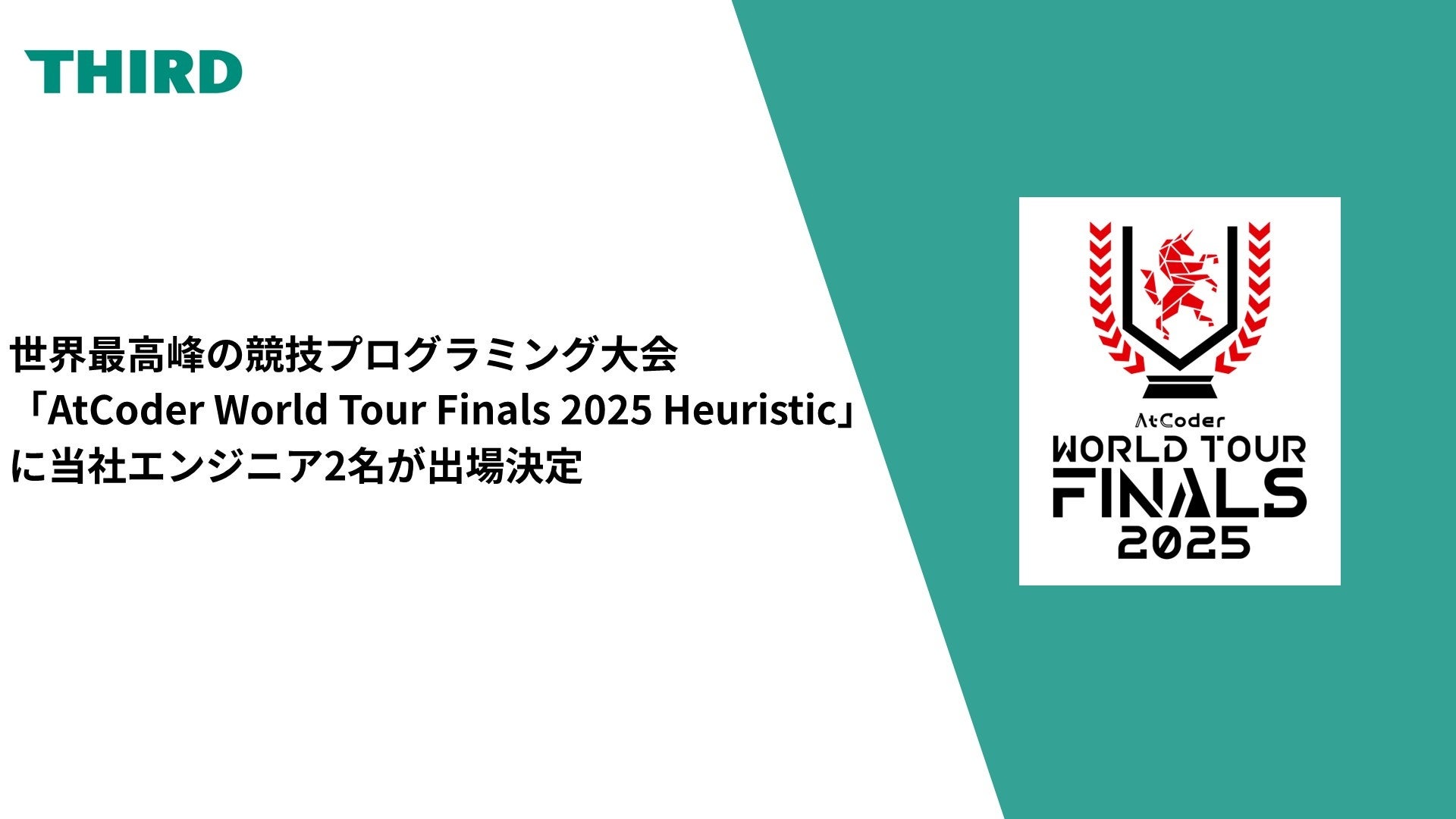 不動産・建築業界向けのAI開発を手掛ける株式会社THIRD(本社:東京都新宿区、代表取締役:井上 惇)は、世界最高峰の競技プログラミングサイトAtCoder主催の「AtCoder World Tour Finals 2025 Heuristic」に、当社所属のエンジニア2名が出場することをお知らせいたします。