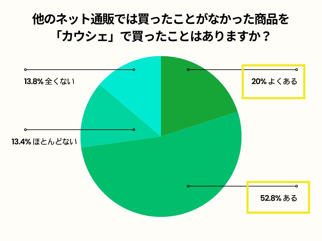 また、2023年11月に「カウシェ」のお客様1224人を対象に実施したアンケートにおいても、「他のECサイトでは買ったことがなかった商品を、カウシェで買ったことありますか?」という問いに対し、7割以上の方が「よくある」「ある」と回答しています。これは、本来購入をしようと思っていなかった商品でも、「カウシェファーム」をはじめ、ゲリラセールやランキング、みんなの投稿機能等が、新しい商品を知るきっかけとなり購入に繋がったのではないかと予想できます。