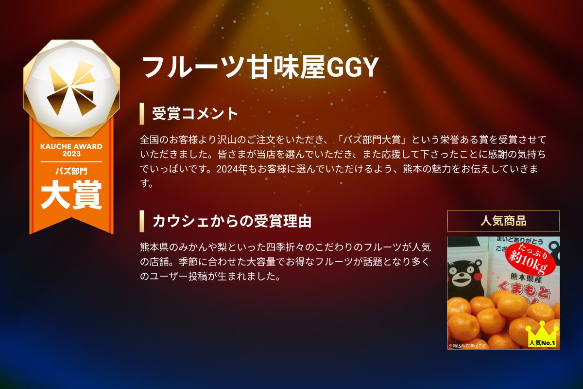 カウシェに出店する事業者の中で、売上、成長率、注文件数、お客様対応、お客様からの評価やリピート率などを、カウシェ独自の基準から総合的に評価し、表彰する部門です。