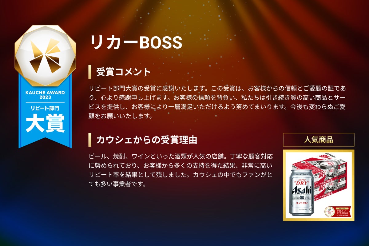 購入したお客様からの評価が高く、リピートが多い商品を販売している事業者を、カウシェ独自の基準から評価し、表彰する部門です。