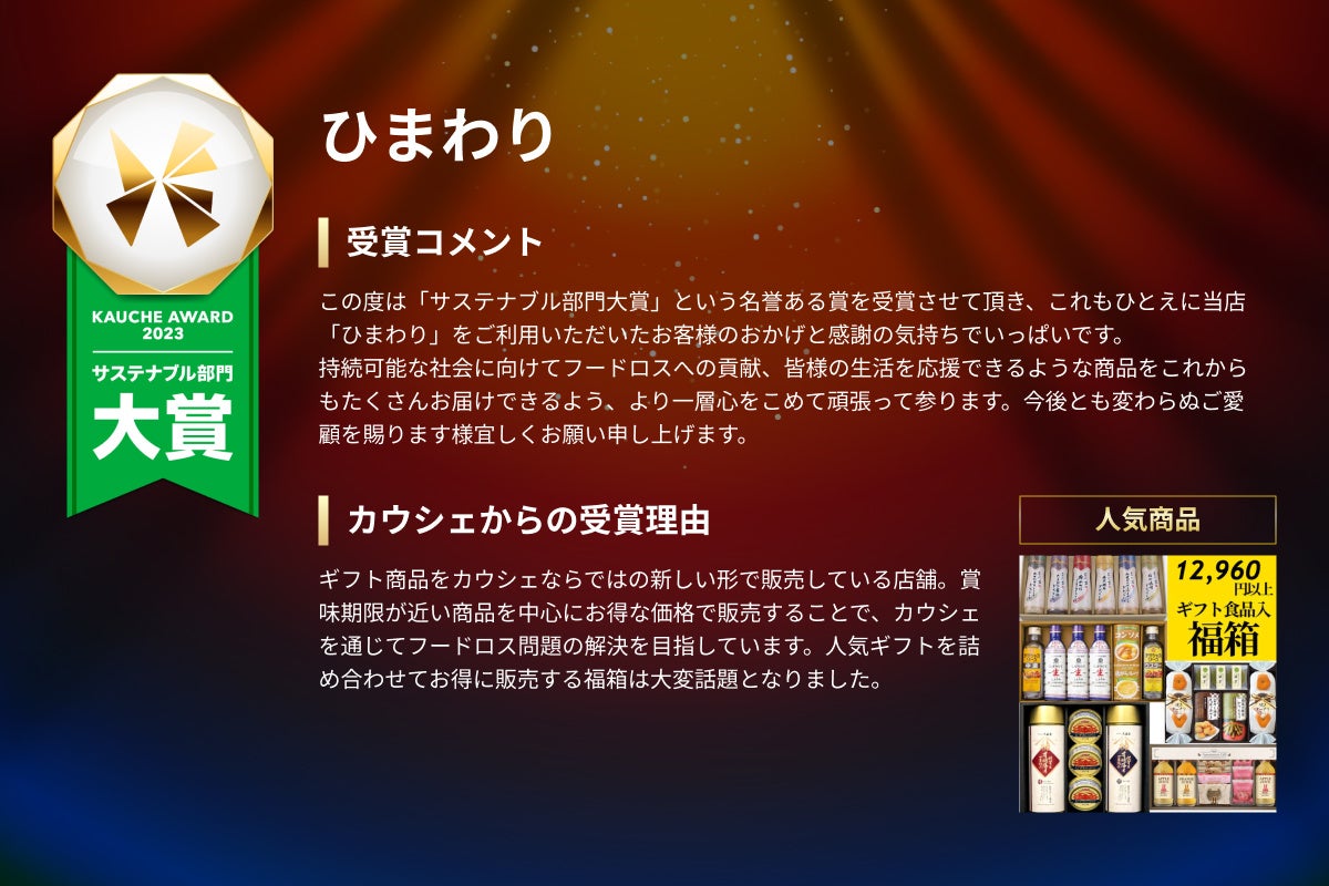 2023年に「カウシェ」に出店している事業者を、売上、リピート購入数、またサステナブルな観点等から表彰する「KAUCHE AWARD(カウシェアワード)2023」を実施いたしました。