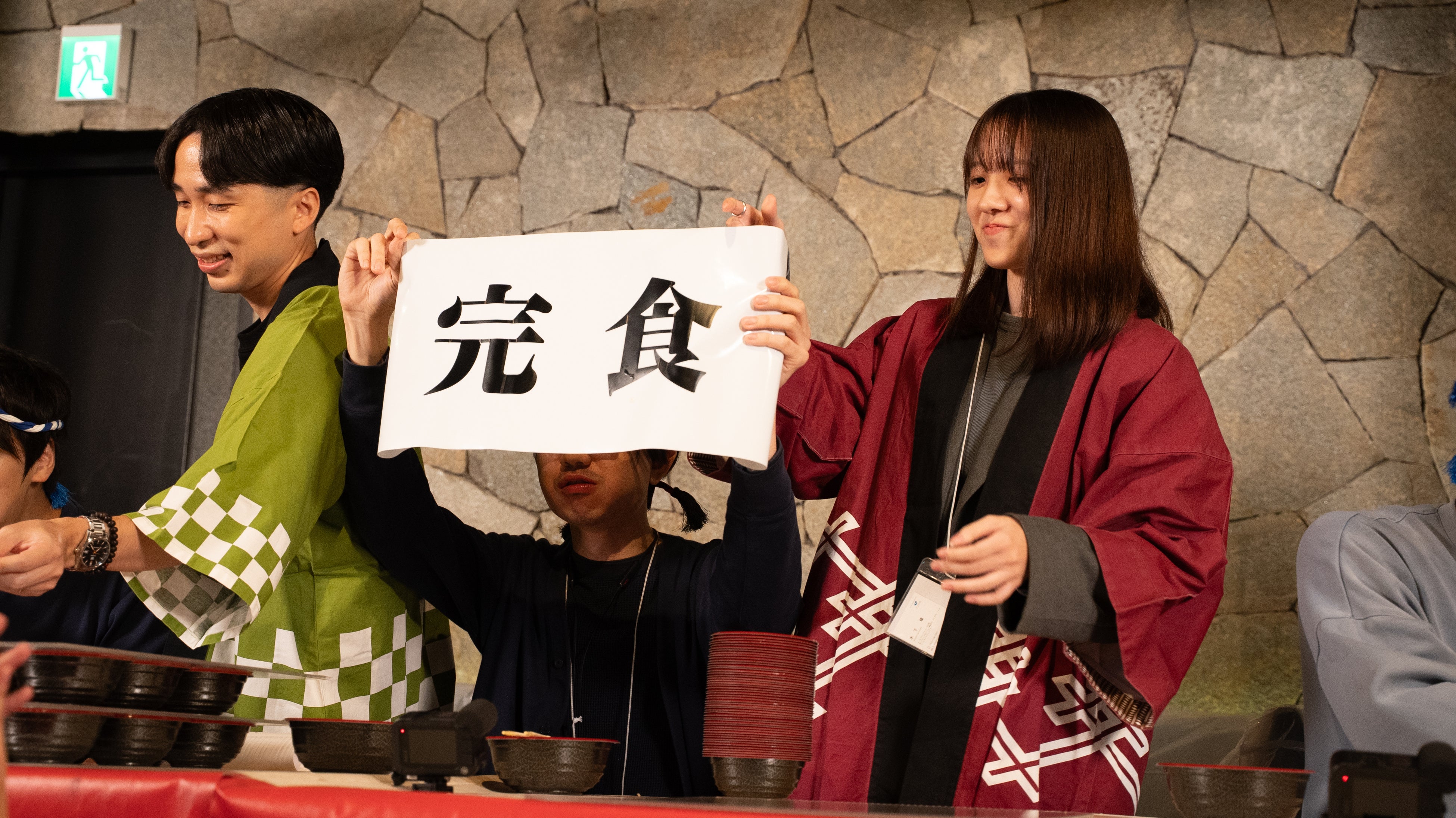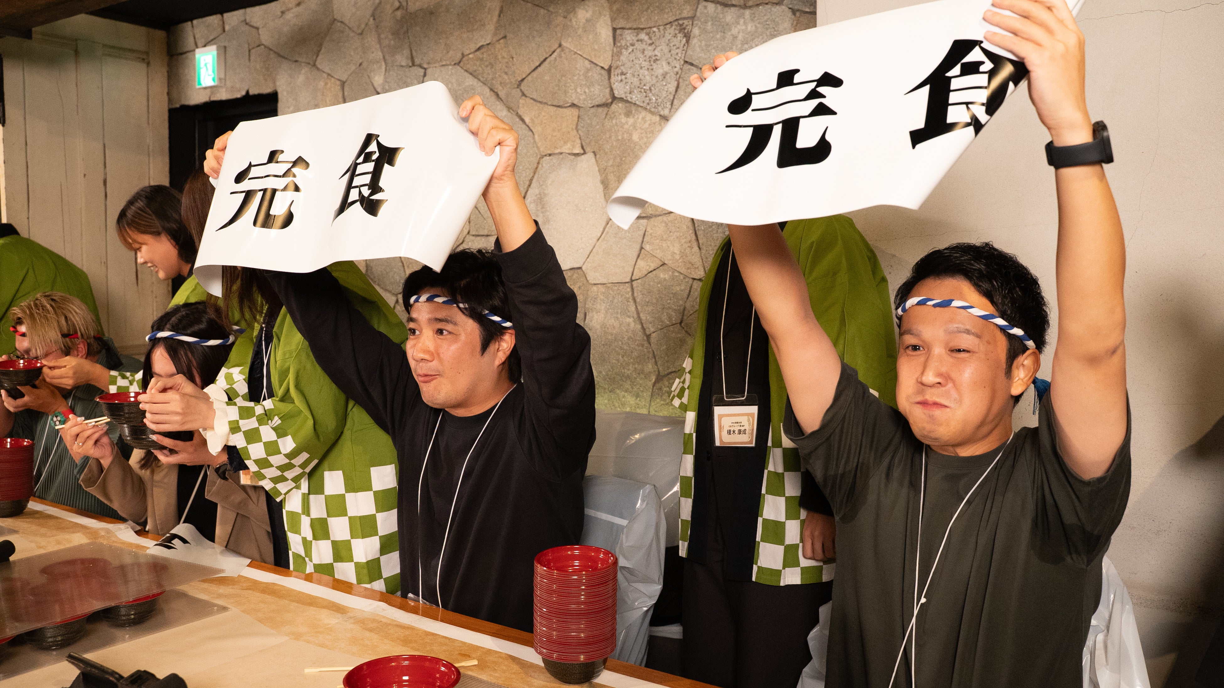 ドキドキの熱戦に会場からも応援の声や拍手が上がります。序盤からスピードで勝負してきたのはBASEとrayout。「1回戦よりペースが早い!」と司会もビックリ。そこにフジヤが追い上げ!その驚異のスピードに出場者は焦り始めているよう。給仕係も応援の声掛けをしています。マイナビ、博報堂プロダクツも粘りますが、お腹が苦しくなってきている様子。そんな出場者を横目に、表情を変えずに食べ続けたrayoutが最初に完食!完食後も、隣の席の博報堂プロダクツが食べきれなかった蕎麦を頂き、余裕の様子です……。それに続き、フジヤ、BASEも『完食』の幕を掲げました。