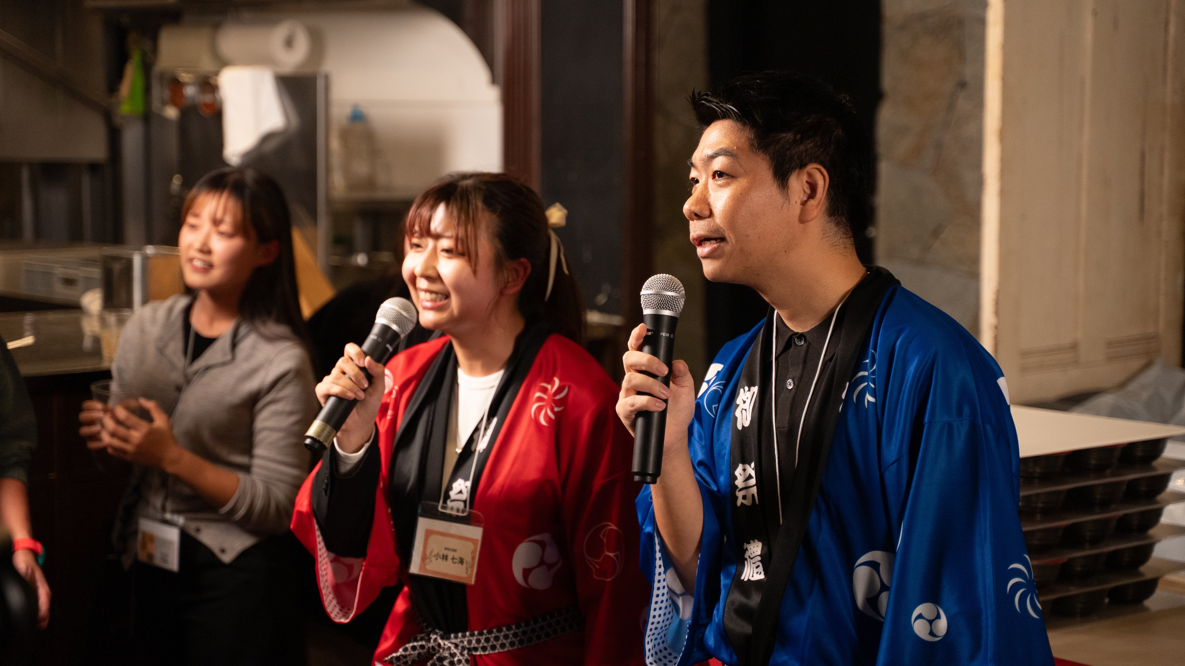 いよいよわんこそば大会の開始。和を感じさせる音楽が鳴り響く中、法被姿の司会が登場します。