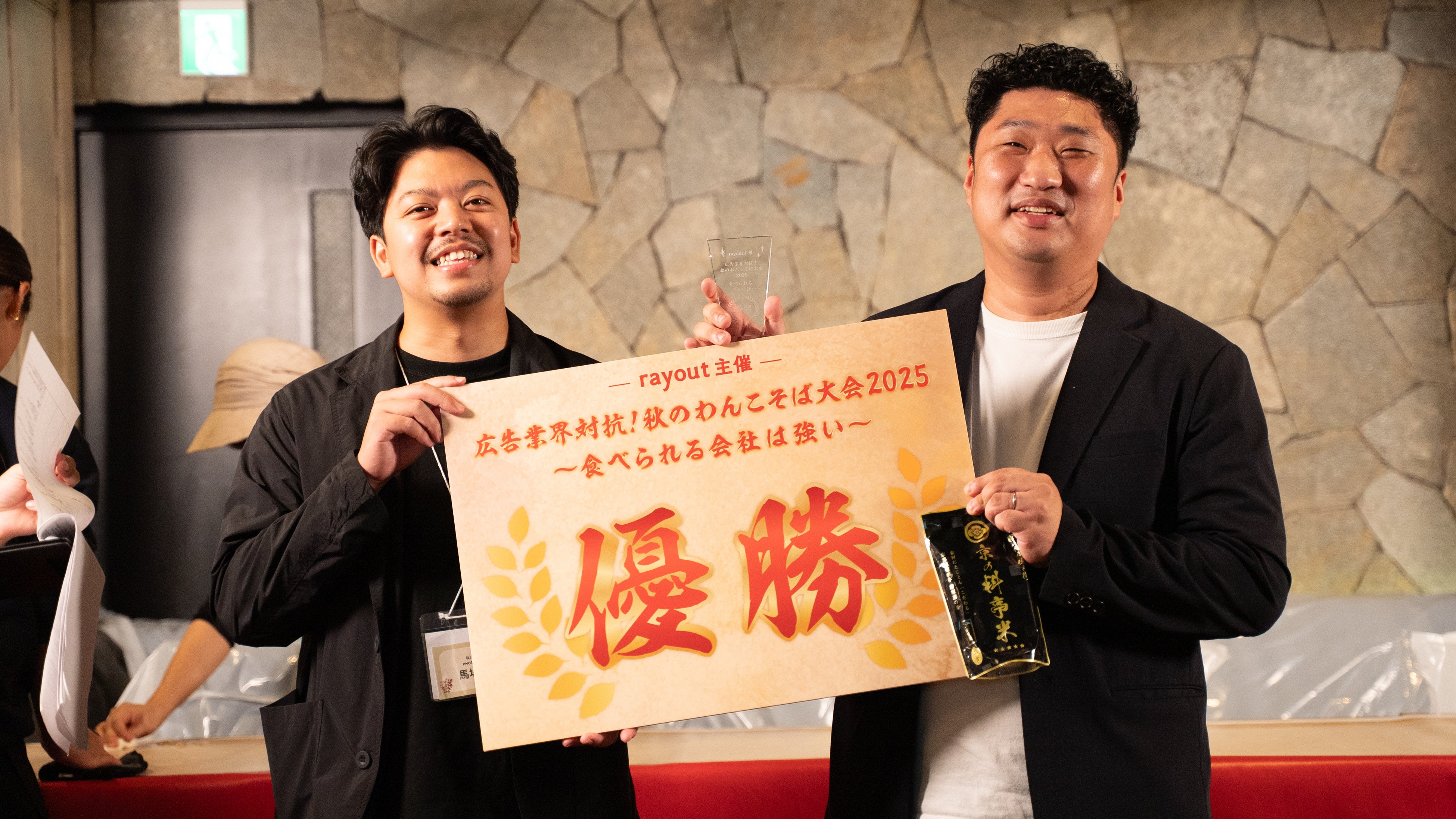 優勝ボードとトロフィー、米を受け取った権は、「奥さんからいつもご飯は噛んで食べろと言われているんですけど、初めて言うこと聞かなくて良かったと思いました(笑)。皆さんと一緒にお仕事がしたいので今日頑張りました。案件お待ちしております!」とコメント。