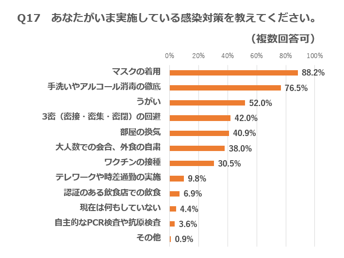 自身がいま実施している新型コロナ感染対策を複数回答で聞くと「マスク着用」88.2%が最多で「手洗いやアルコール消毒の徹底」76.5%が続いた。22年8月調査でも1位と2位は同じだった。(Q17)