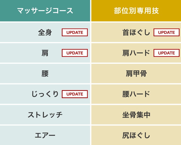その日の疲れやお好みに合わせて簡単にお選びいただける6種類のマッサージコースと、疲れを感じる部位を重点的にマッサージする6種類の専用技のうち、首や肩を中心にマッサージを行うメニューについては新搭載の「肩交互もみ」を盛り込んだ内容とし、体感向上を目指しました。