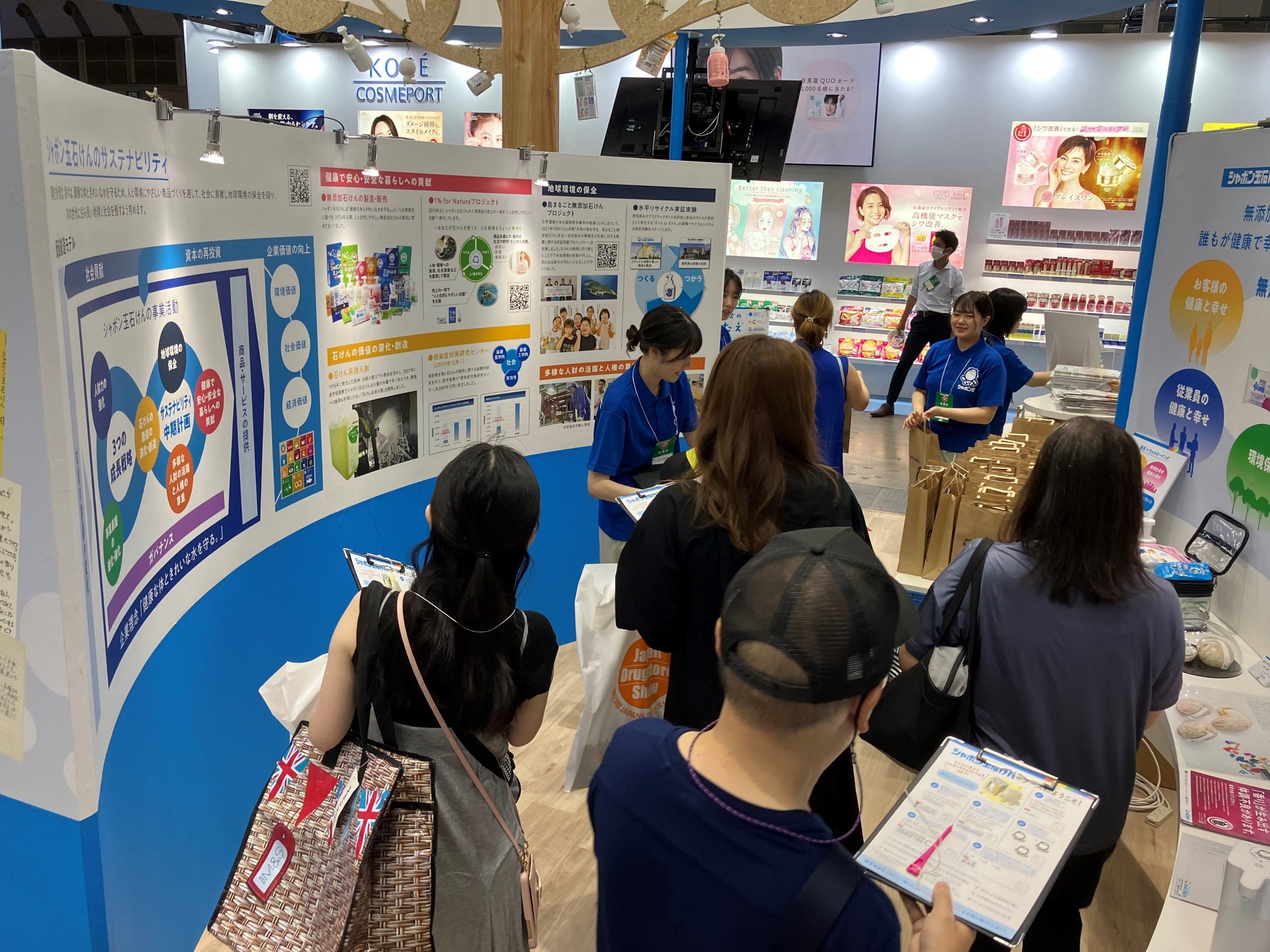 シャボン玉石けんは「健康な体ときれいな水を守る。」という理念のもと、人にも自然にもやさしい無添加石けんの製造・販売を行っています。より多くの方にシャボン玉石けんブランドの意義や価値、商品や信念を知っていただくために、「第23回JAPANドラッグストアショー」に初めて出展いたしました。当ブースではコーポレートカラーの青と白を基調に、ブランドが持つやさしさや、安心・安全なイメージをコンセプトとし、デザインいたしました。また、ブース内では当社の歴史や製法、無添加へのこだわりをお客様に感じていただけるグラフィックを展開し、多くの方に当社ブースへ来訪いただきました。
