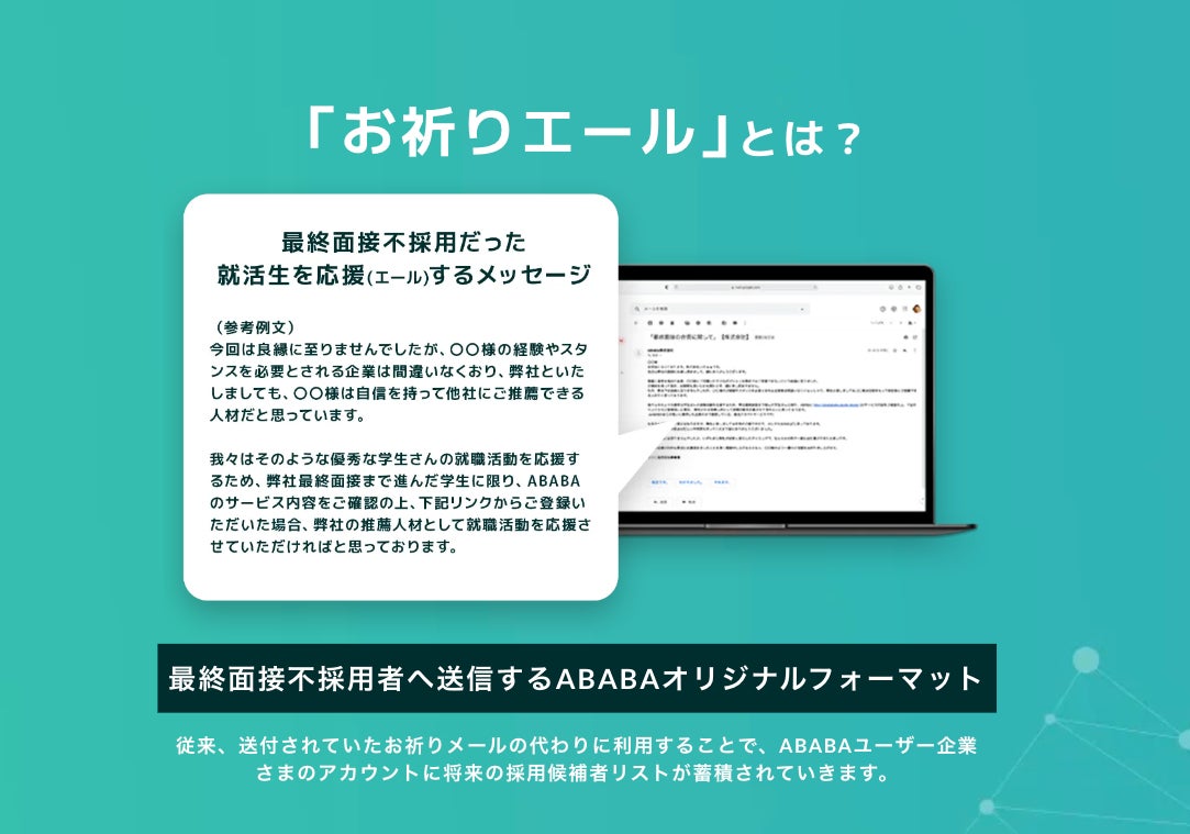 ABABAは企業が就活生に送信する不採用通知=「お祈りメール」を『エール』に変えて送るシステムを作ることで企業のブランドイメージの保持・向上にも貢献しています。