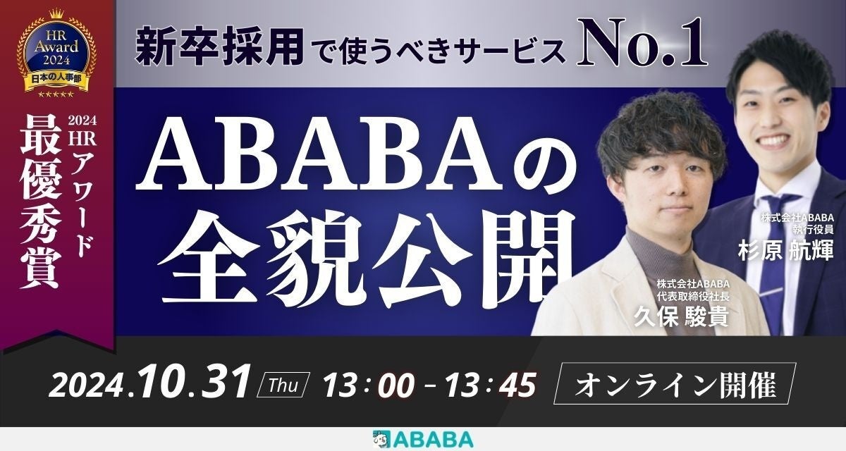 株式会社ABABA(本社:大阪府吹田市、代表取締役社長:久保駿貴・中井達也、以下「ABABA」)の提供するダイレクトリクルーティングサービス『ABABA』が、日本の人事部「HRアワード2024」(主催:「HRアワード」運営委員会、後援:厚生労働省)にて、プロフェッショナル部門(人材採用・雇用)最優秀賞に選ばれました。