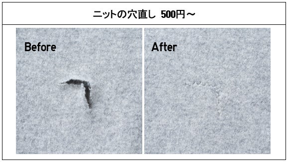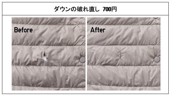 Tシャツやニット、ダウンジャケットの穴修理、ジーンズのほつれや股ずれなどの補修、ボタン付けなどの