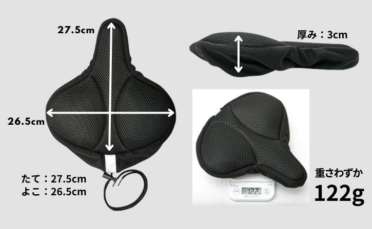 たて27.5cm、よこ26.5cm、厚み3cm 重さわずか122g、とっても軽いサドルカバーです。