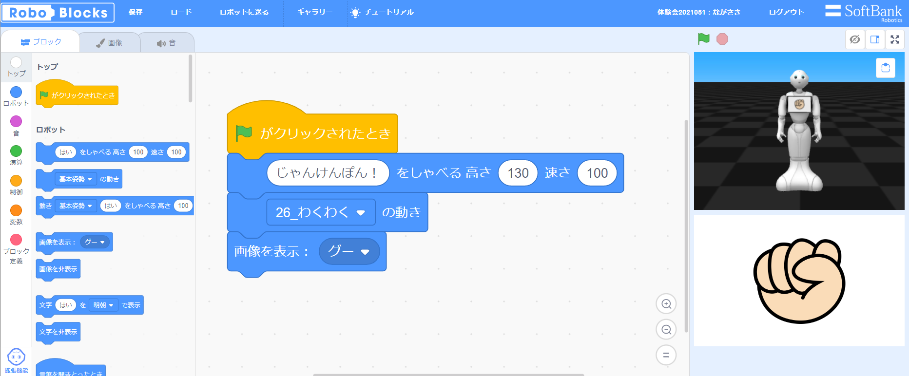 Pepperを動かしたりしゃべらせたりすることはもちろんのこと、会話、移動、ディスプレイ表示、音の再生、タッチセンサ、変数、リスト、ブロック定義など、120種類以上のブロックを使ってさまざまなプログラミングを体験することができます。