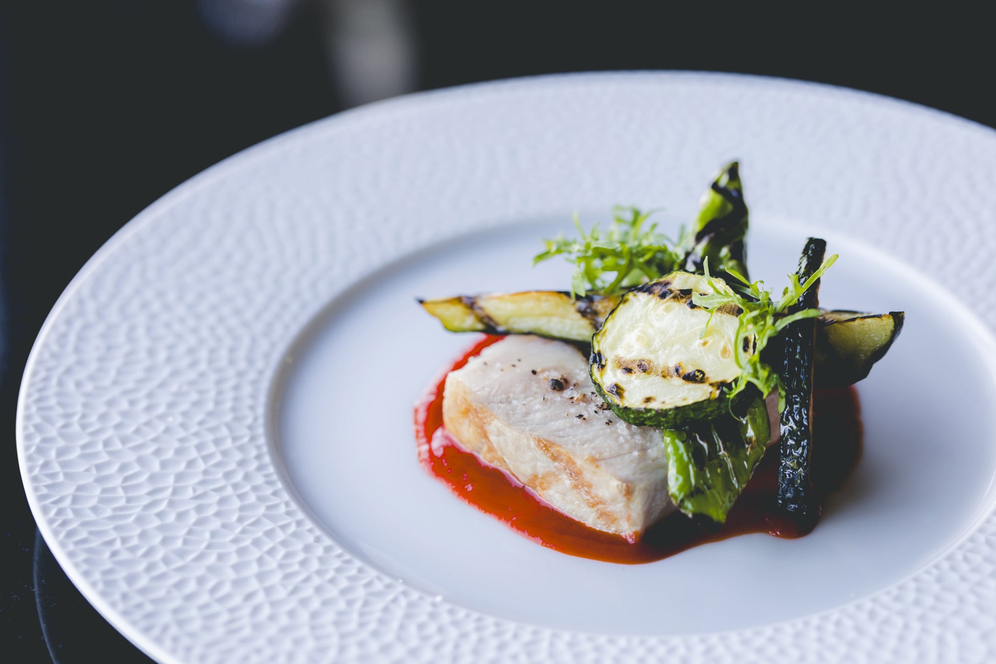 フレッシュな夏野菜や旬の魚介類をふんだんに取り入れた料理で構成される今期の夏メニューの中でも、 石川県で赤イカと呼ばれる剣先イカの前菜は、キャビアと夏の緑野菜のラタトゥイユと共に仕立てます。産地より直接仕入れた新鮮なイカをご堪能ください。