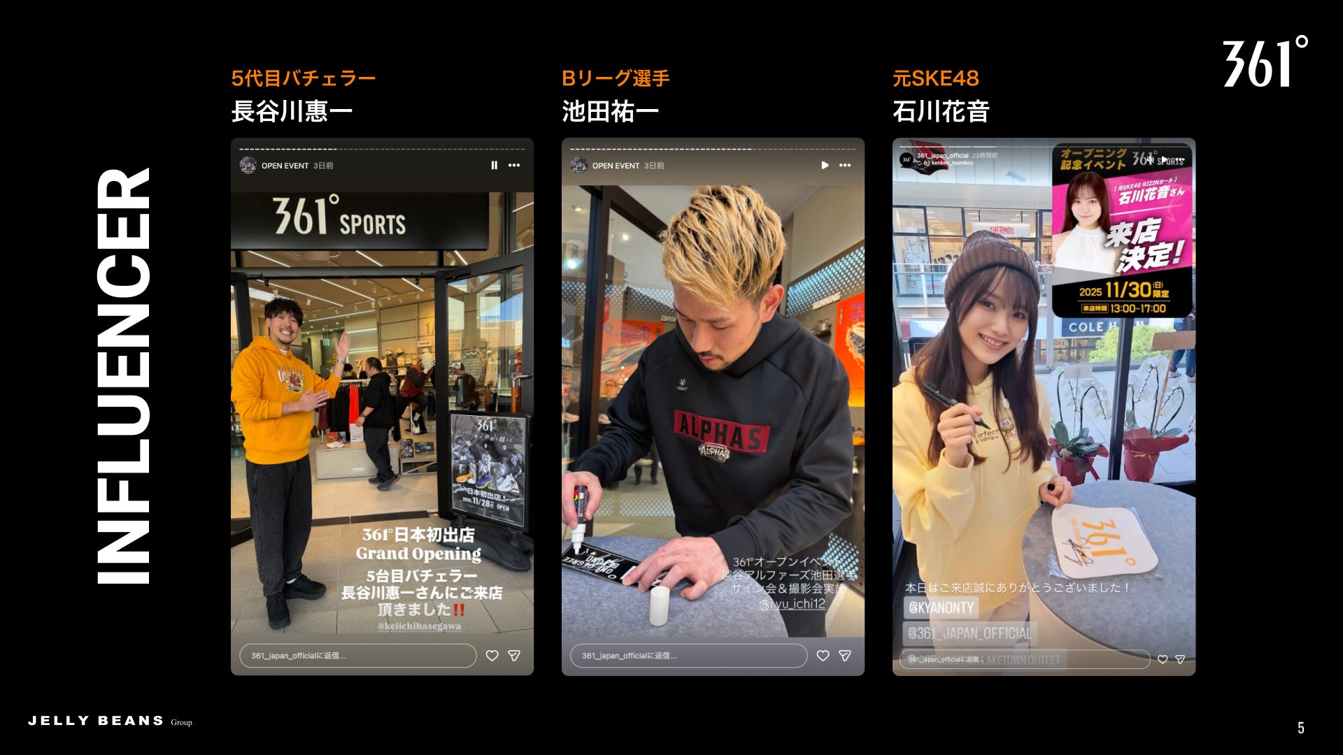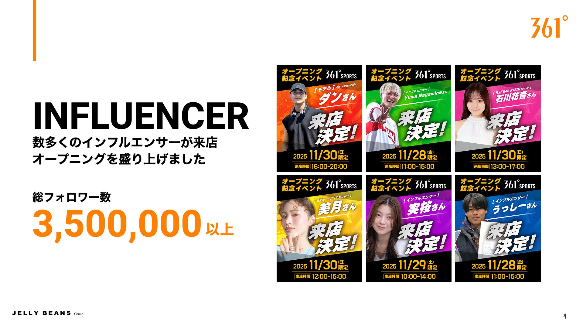 株式会社ジェリービーンズグループ(本社:東京都台東区、代表取締役:宮﨑 明、以下「ジェリービーンズ」という)の連結子会社である株式会社361 Sports Japan(東京都中央区、代表取締役:林 光、以下「361 Sports Japan」という)は、世界70カ国、7000拠点に展開するグローバルスポーツブランド「361°(スリーシックスティーワン)」の日本第1号店となるオフィシャルストアを、2025年11月28日(金)に越谷レイクタウンアウトレットにオープンいたしました 。