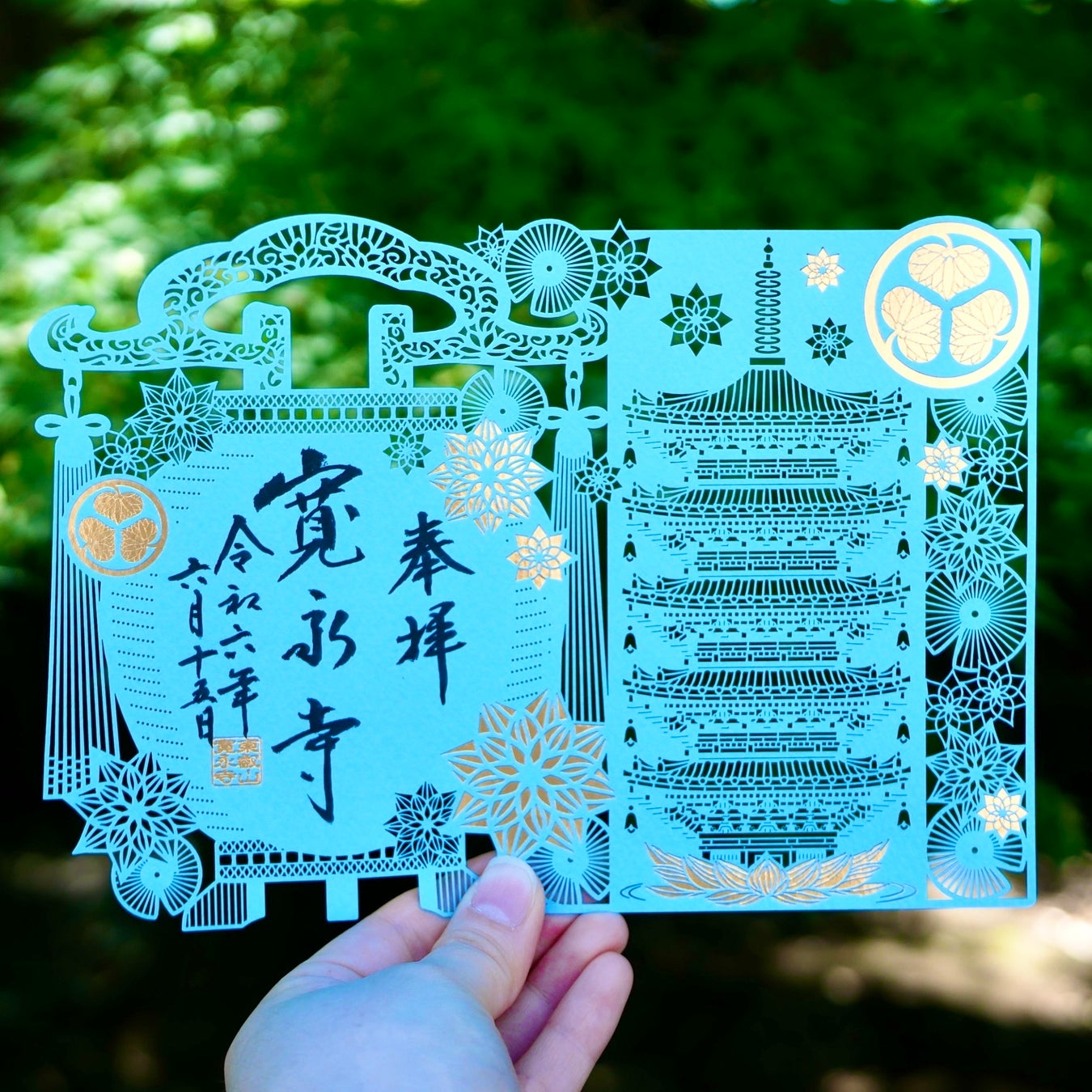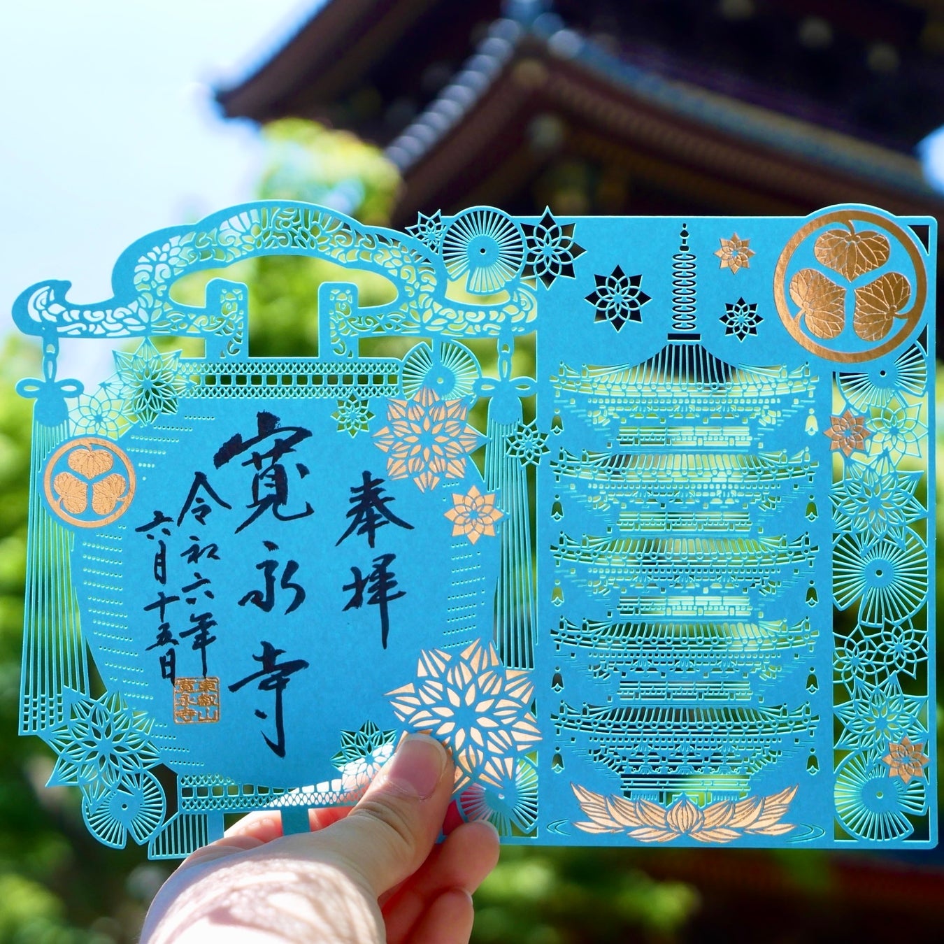 徳川切り絵御朱印の第六段となる夏限定の切り絵御朱印です。現在東京都に寄贈されている「旧寛永寺五重塔」とお盆をイメージし、奉製しました。暑い夏に爽やかな風を感じさせてくれるブルーの台紙に金の箔押しと細かな切り絵を施しています。上野の夏をこの一枚で感じ取っていただける御朱印です。