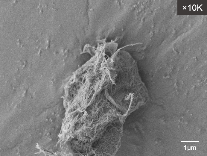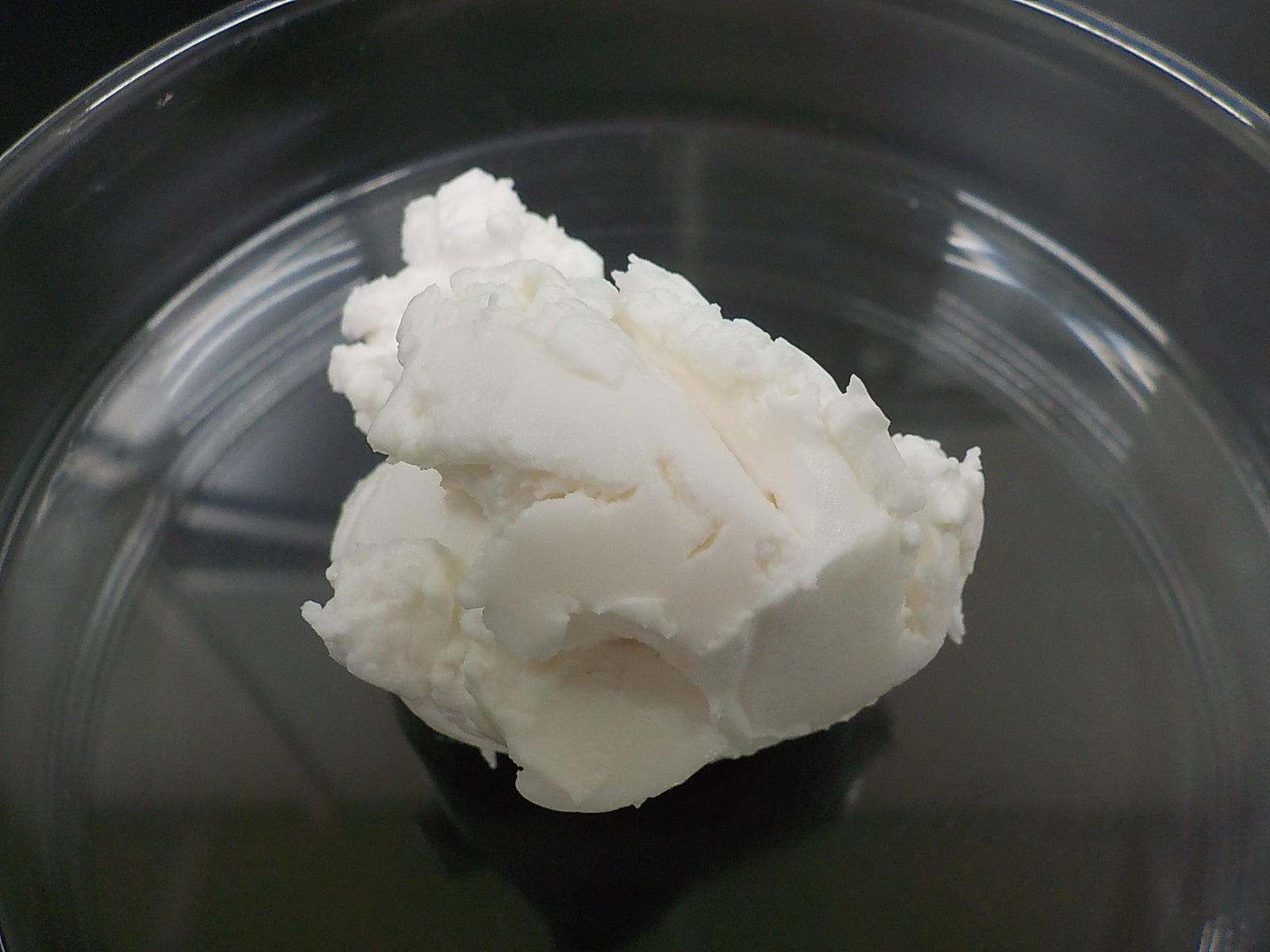 また、複数混合油のワンステップ乳化や充填結合剤としての利用など、CNFとは異なる用途展開が期待されます。濃度25wt%の水分散体の外観は白色のペースト状であり(図1)、これを乾燥化して観察すると粒子表面に繊維状