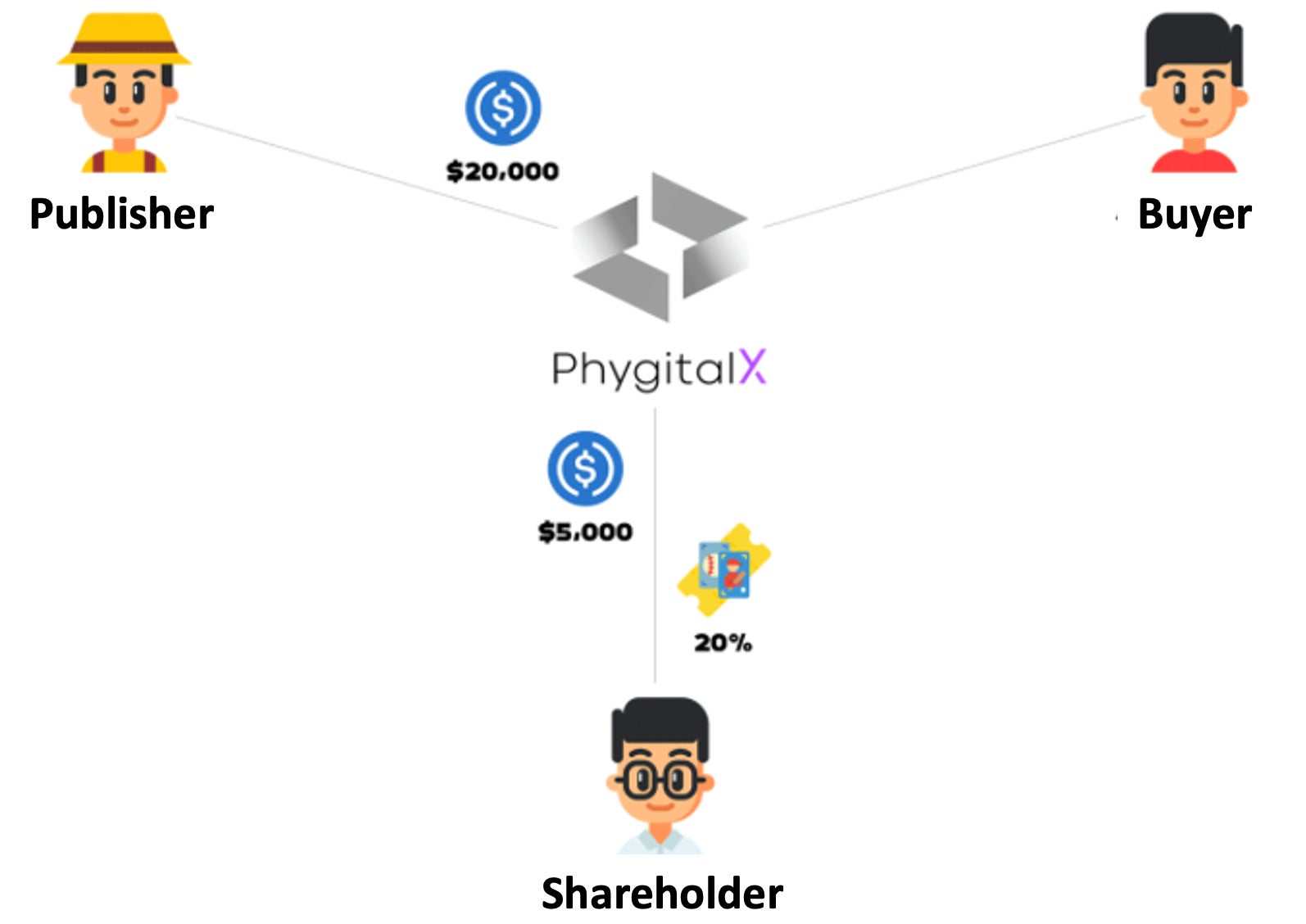 たとえば、Aさんが(発行者:Publisher)保有している、PhygitalXでERC-721トークンとしてトークン化されたトレーディングカード(以下、トレカ)をNFTとして販売する場合、Cさん(ホルダー:Shareholder)がそのカードの総価値が$20,000の時に、20%の分割所有権を$4,000で購入し、その後、Bさん(バイヤー:Buyer)がこのNFTを$24,000で購入したとします。