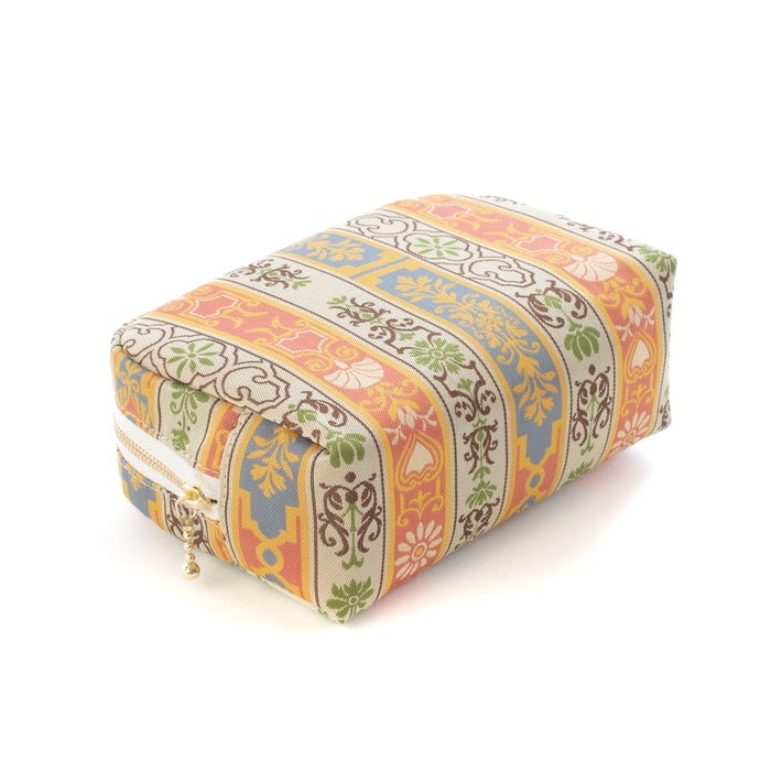 表生地には、優美な意匠や華やかな印象が女性に人気な「ロワール飾花文」をあしらい、格式と華やぎを兼ね備えたBOX型ポーチに仕立てました。YKK製のファスナーを採用し、裏地には汚れを拭き取りやすい素材を使用するなど、細部にまでこだわった特製仕様となっております。