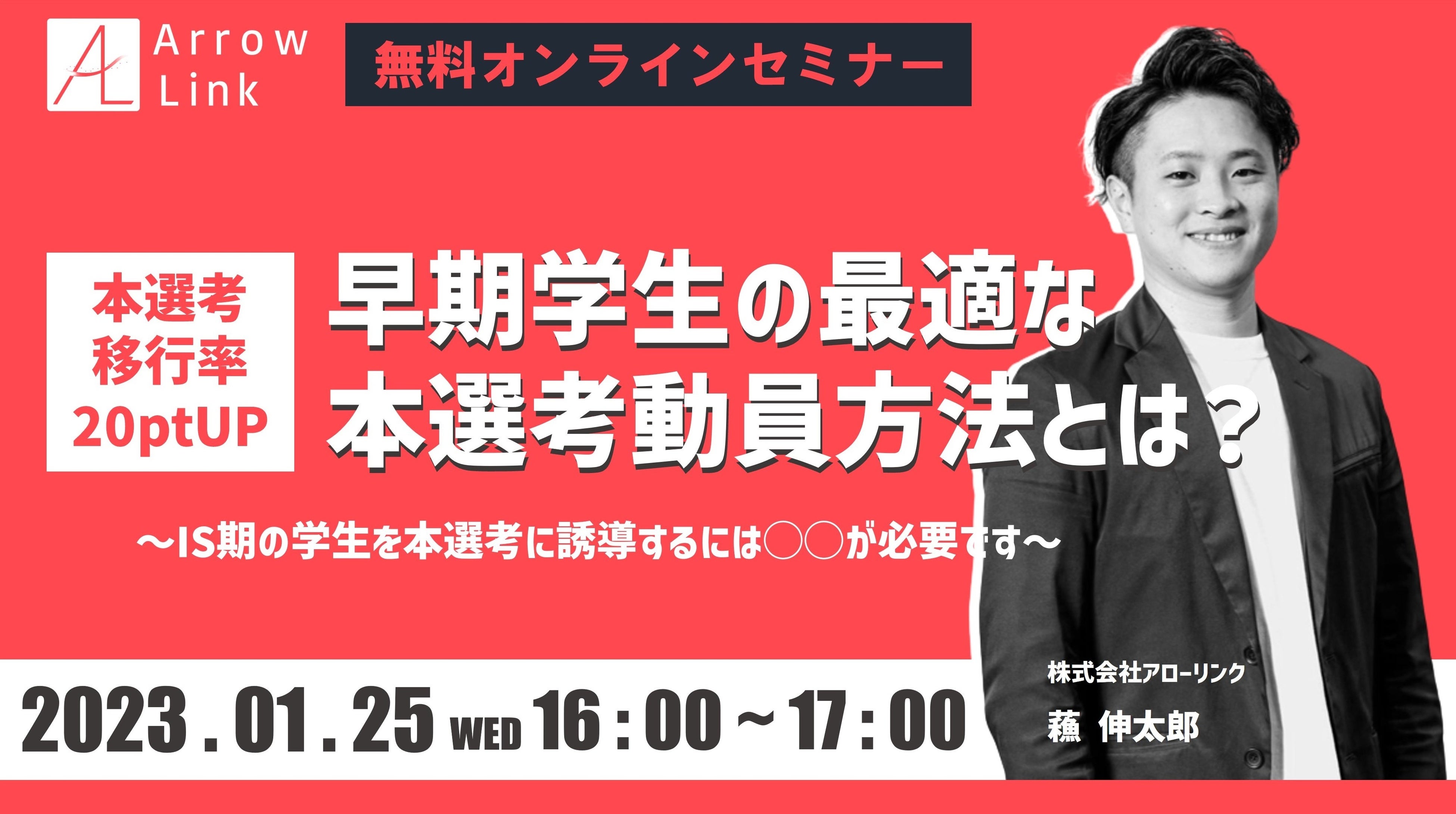 株式会社アローリンク(本社:兵庫県神戸市、代表取締役:蓬莱和真)は、2023/01/25(水)に無料のオンラインセミナーを開催します。「本選考移行率20ptUP!! 早期学生の最適な本選考動員方法とは?」と題し、本選考移行率を上げる秘策を詳しくお伝えします。