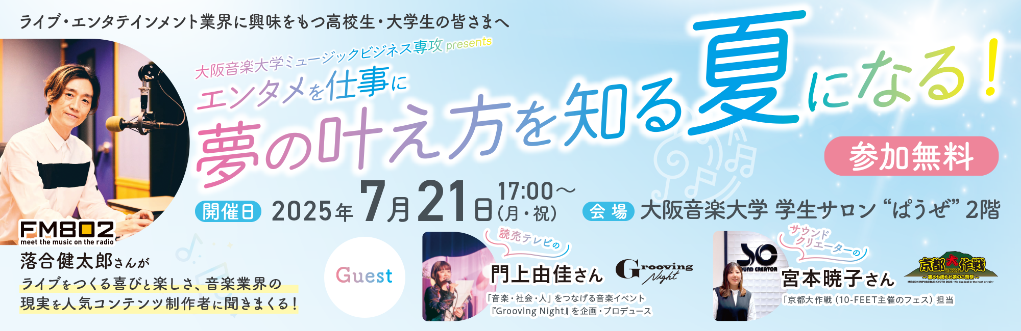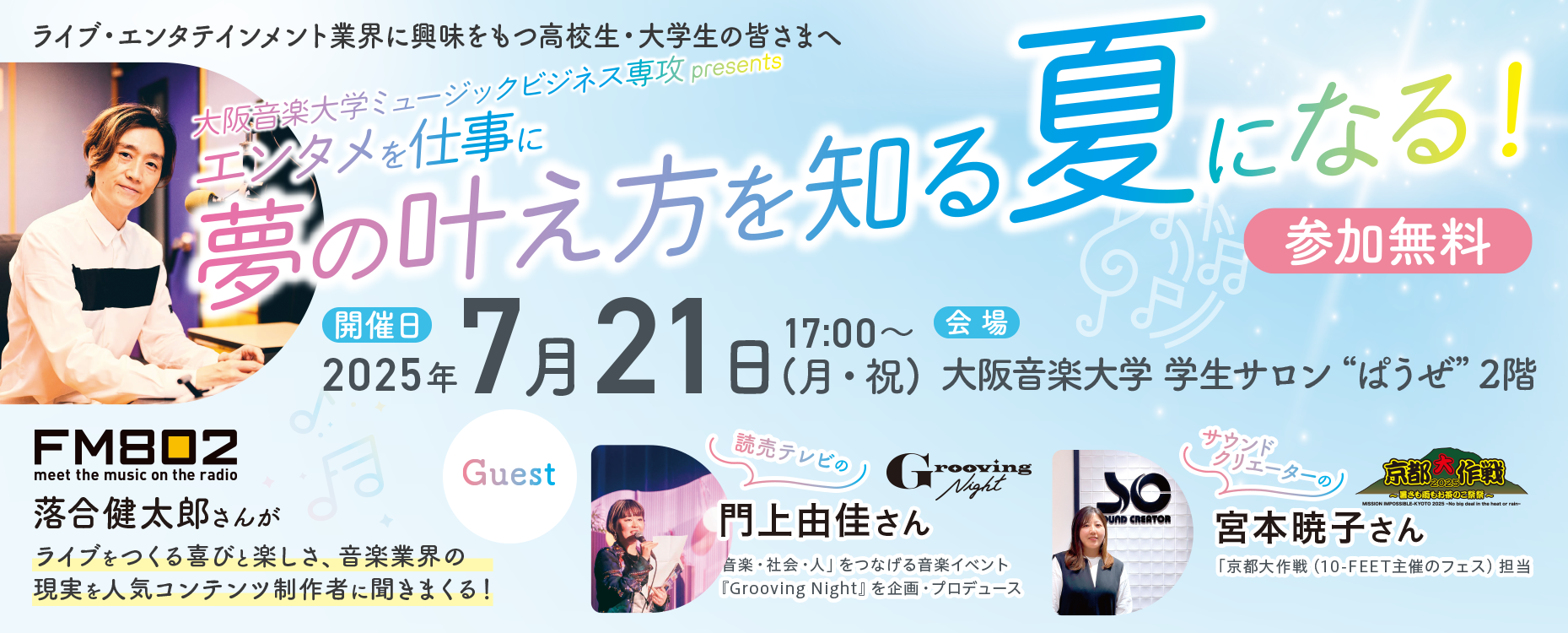 【大阪音楽大学MB専攻】7/21特別公開講座「エンタメを仕事に 夢の叶え方を知る夏になる!」FM802 DJ落合健太郎氏がライブをつくる喜びと楽しさ、音楽業界の現実を人気コンテンツ制作者に聞きまくる!