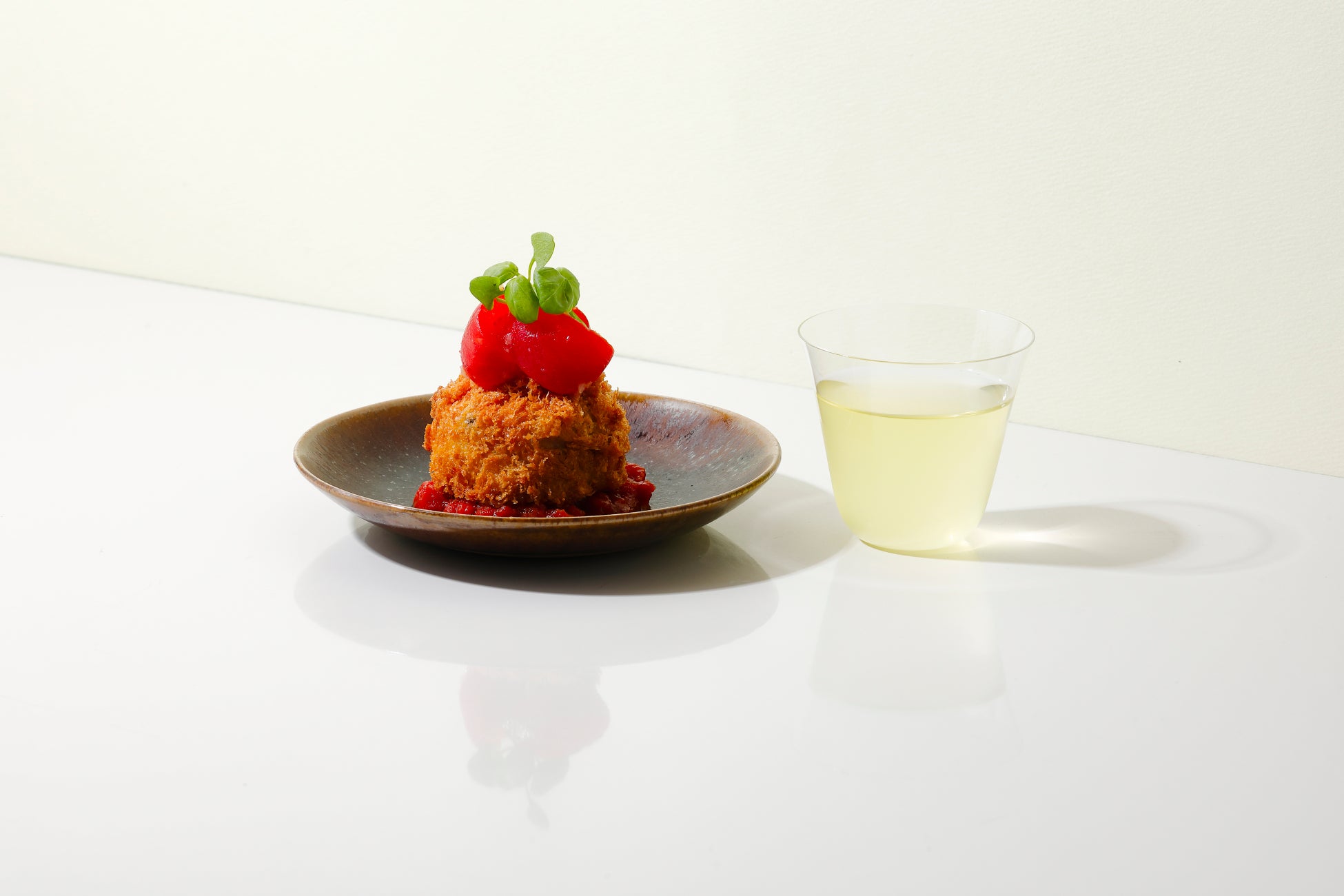 京の伝統野菜・賀茂茄子を贅沢に用いた存在感のあるクロケットは、揚げたてのクリスピーな衣と、瑞々しくジューシーな賀茂茄子が絶妙に調和する風味豊かな一品。新生姜でマリネしたフルーツトマトやバジルが爽やかさを、旨味と渋みのバランスが取れた煎茶がクロケットの旨味をより一層引き立て、それぞれの素材が織りなす奥行きある味わいをご堪能ください。