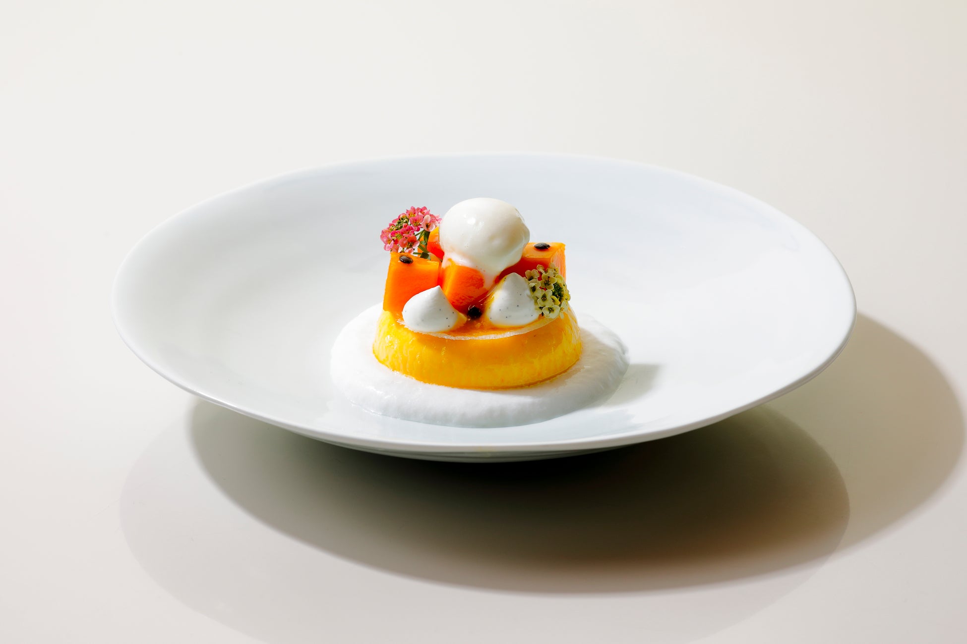 目にも鮮やかなビタミンカラーが夏に映える華やかなデザート。濃厚な甘みととろける果肉が魅力の宮崎マンゴーを使用したマンゴープリンに、軽やかなココナッツエスプーマを重ね、南国を感じさせる絶妙なハーモニーに仕立てました。サイコロ状にカットした完熟マンゴー、シャンティークリーム、ココナッツアイスを添え、滑らかな口当たりと、芳醇なマンゴーの香りが広がる、夏にこそ味わいたいトロピカルな一品をお楽しみください。