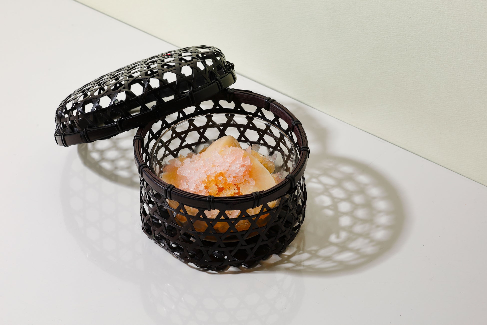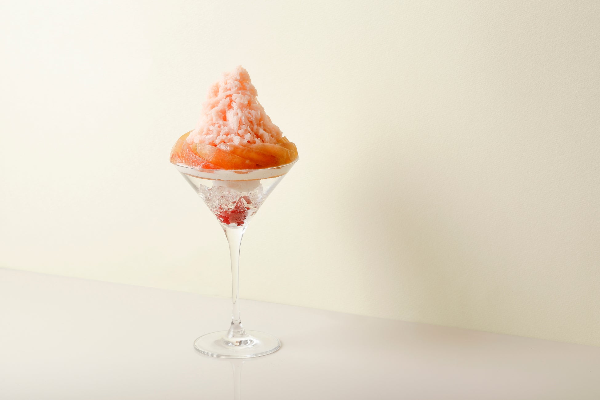 コースの中盤に爽やかなアクセントをもたらす、ジューシーな桃と香り高い和紅茶のアールグレイのかき氷。ひんやりとした口当たりが心地よく、暑い季節にふさわしい清涼感ある一品は、お口の中をすっきりとさせ、この後に続くスイーツへの期待感を高めます。
