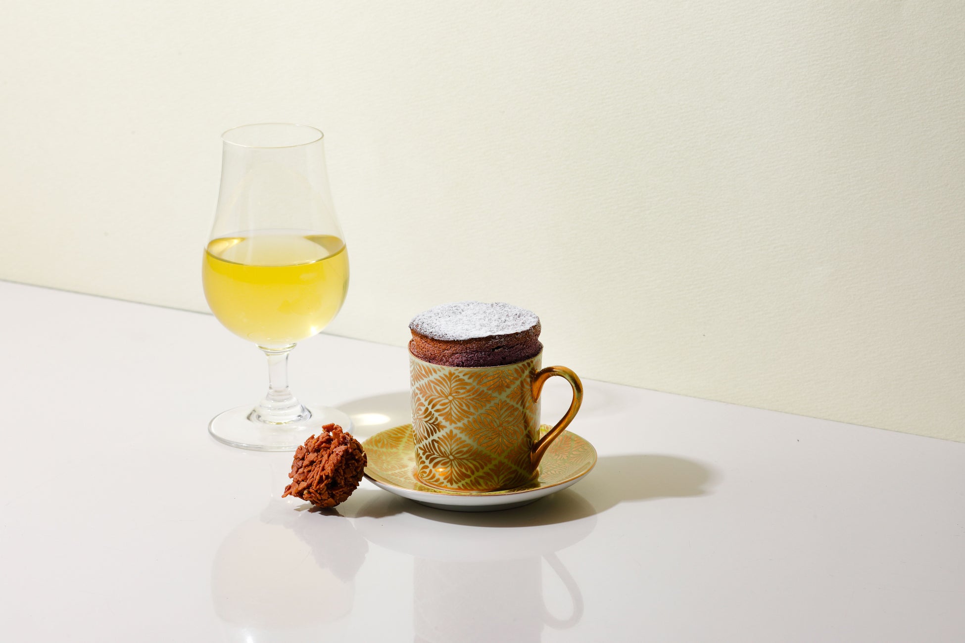 旬のブルーベリーの優しい甘さに、井ノ倉ファームの烏龍茶“かぜのしずく”の穏やかな香りが重なり合う繊細なスフレがコースのラストを彩ります。優しい甘みの中にもほどよくのこるカシスの酸味が味わいに奥行きを加え、口の中で静かに広がる上品な余韻をお楽しみいただけます。スフレに用いる“かぜのしずく”をペアリングに、より一層の味わいの調和が楽しめる気品あるデザートです。