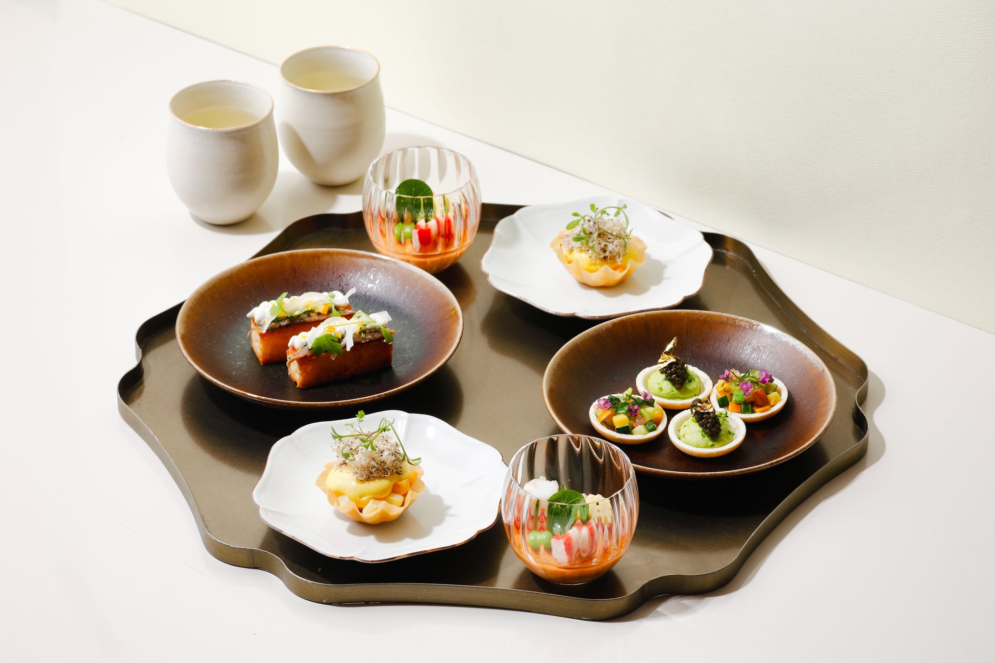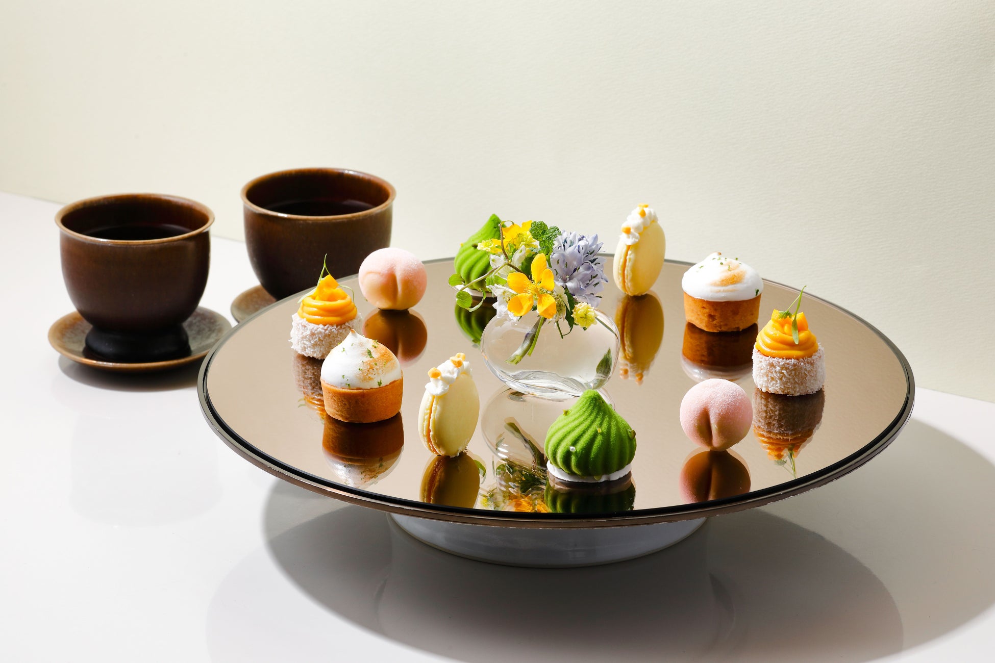 京の伝統野菜・賀茂茄子や、旬のとうもろこしなど、夏ならではの滋味豊かな食材を巧みに取り入れたセイボリーと、細部にまでこだわり、優しい甘みと愛らしい佇まいが魅力のスイーツなど、全5品をコース仕立てでご用意いたします。食欲を誘う彩り豊かなセイボリー、涼やかなミラースタンドに映し出される目にも涼を届ける美しいアソートスイーツは、盛夏の京の暑さを忘れさせてくれる、贅を尽くした仕立てでご提供いたします。それぞれの一皿に寄り添うように選んだ日本茶とのペアリングスタイルにて、味わいの奥行きをお楽しみいただけるアフタヌーンティーです。