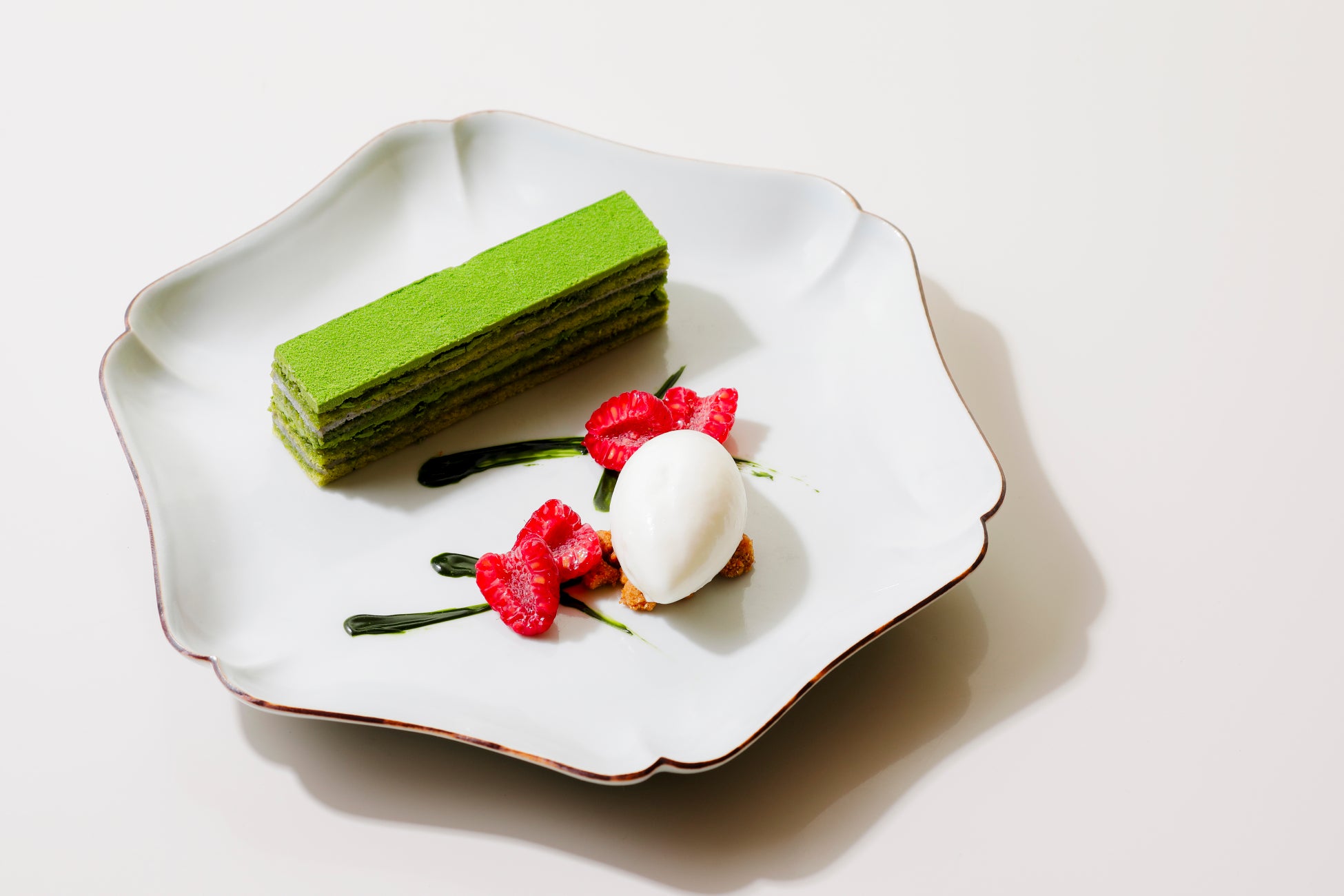 京都の老舗「一保堂茶舗」の抹茶を使用したクリームと、黒ゴマのガナッシュを幾重にも重ね、奥行きのある味わいに仕立てたオペラケーキ。まろやかで深みのある抹茶と、香ばしい黒ゴマのガナッシュのコクが絶妙に調和し、豊かな余韻を残すリッチな味わいへと仕立てました。仕上げに、ゲランド産の塩を利かせたミルクアイスクリーム添え、味わいに軽やかなコントラストを添えた、甘さ控えめで繊細な大人のためのデザートです。