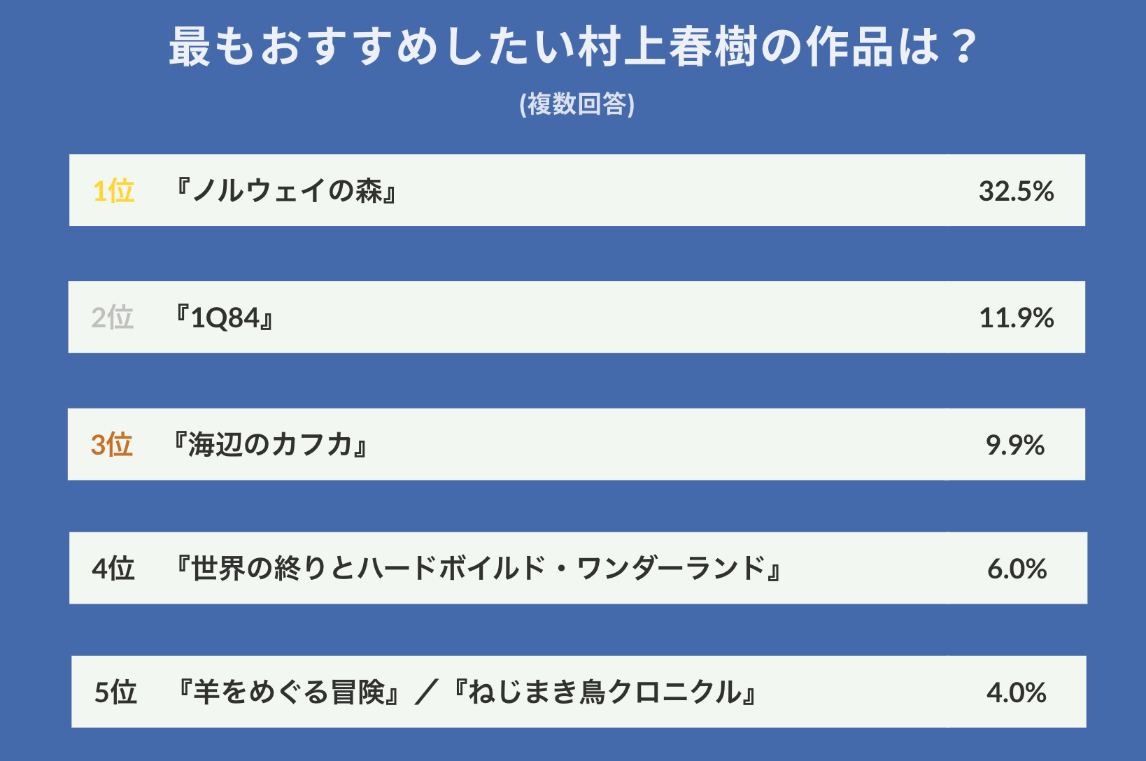 村上春樹さんをまだ読んだことがない方は、ぜひ本アンケート調査を参考に、まずは『ノルウェイの森』から読んでみてはいかがでしょうか。