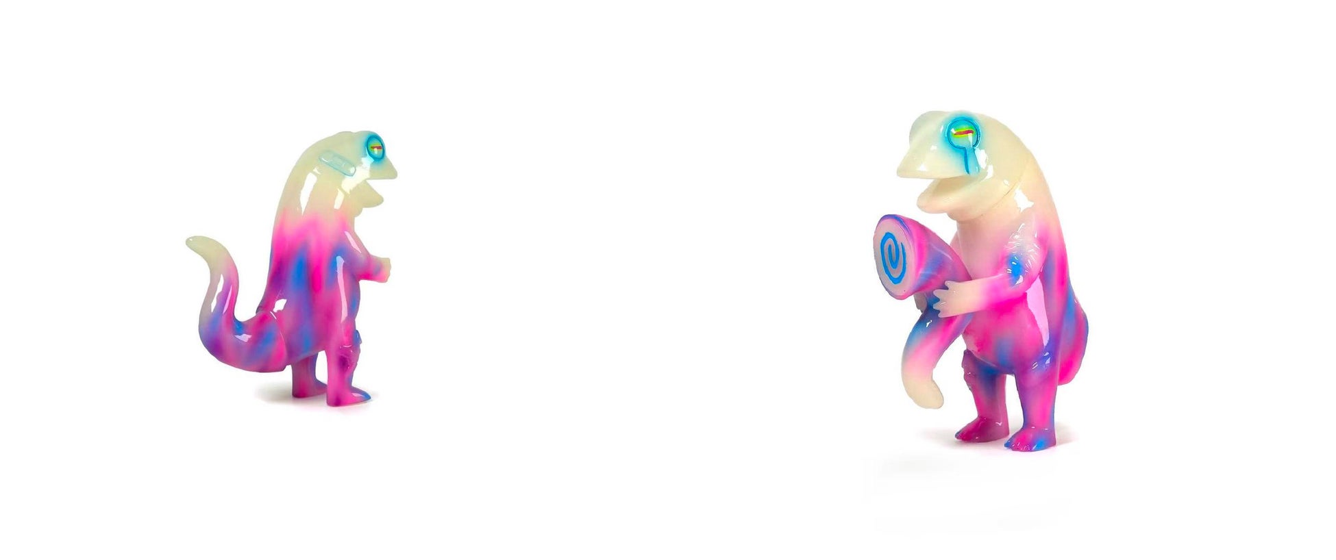 サイケな色彩に、痛がるキャラクターの表情が狂おしく愛おしいポップでキュートなソフビ作品の数々をぜひご覧ください。