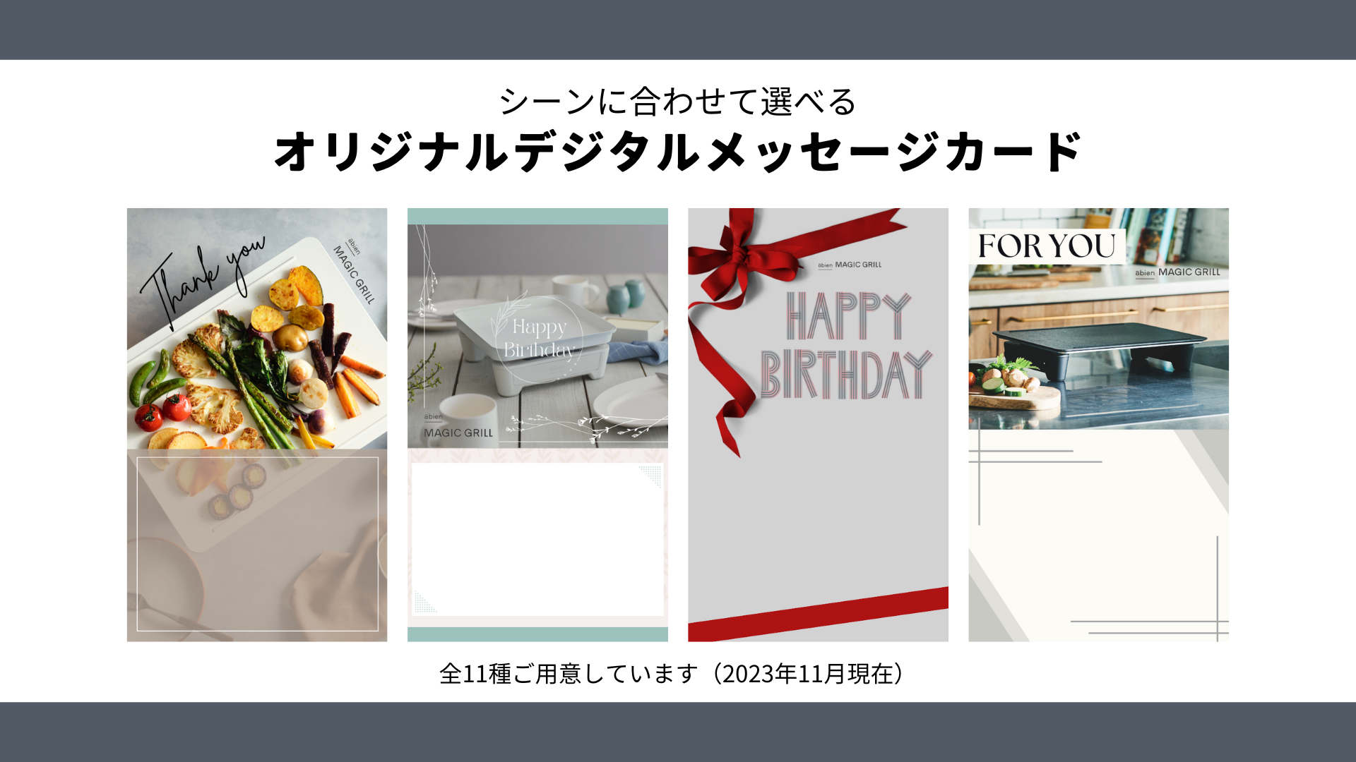 abien公式オンラインショップにてAnyGiftで購入をお選びいただくと、abienオリジナルのデジタルメッセージカードをご利用いただけます。シーンに合わせてお選びいただき、デジタル上でお好きなメッセージを追記することができます。