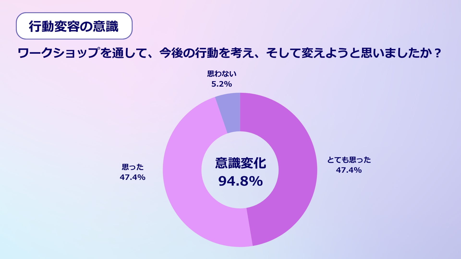 「ワークショップを通して、今後の行動を考え、そして変えようと思いましたか?」という問いには、約95%の参加者が「とても思った」「思った」と回答しました。
