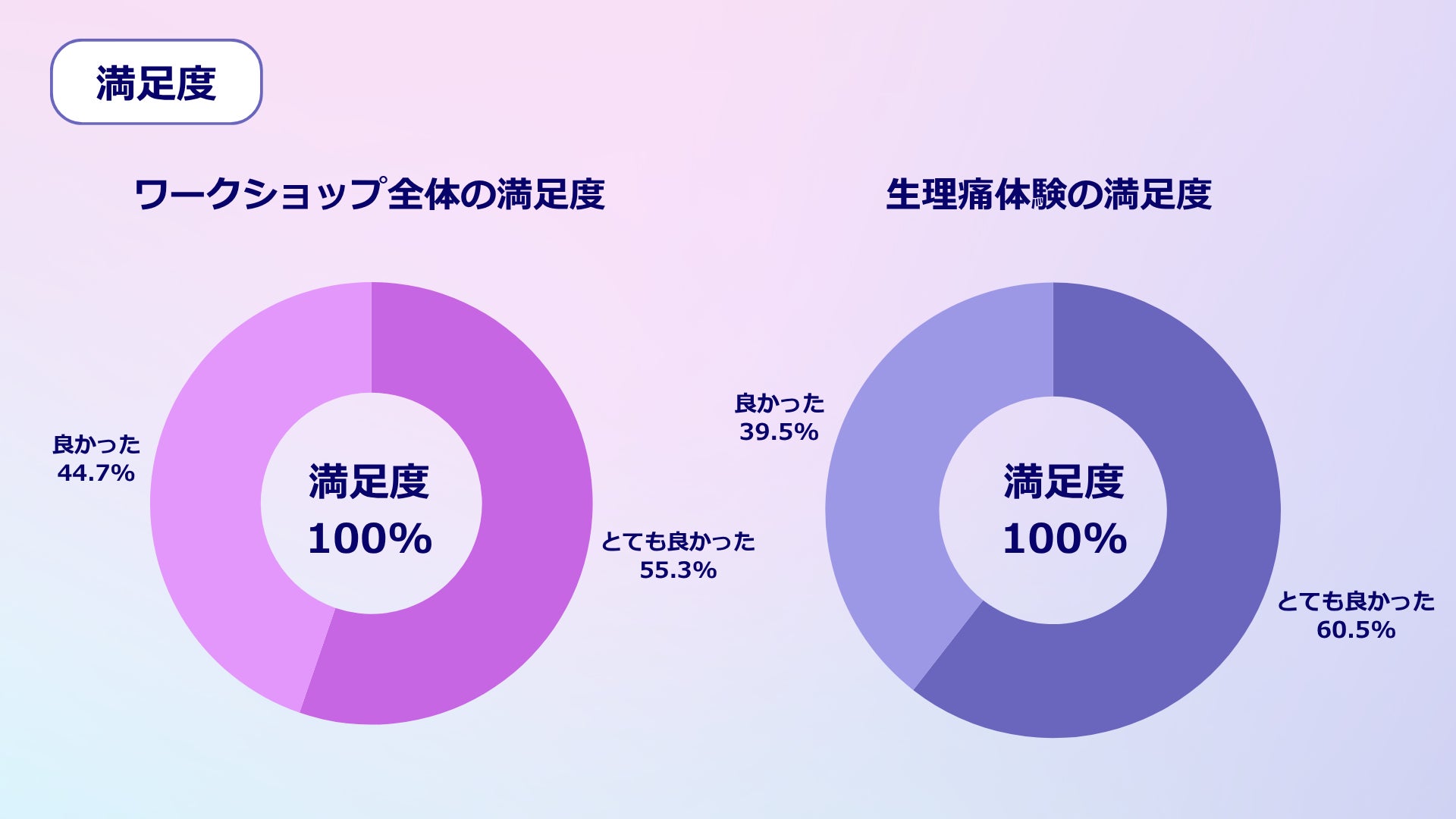 ワークショップ全体・生理痛体験の満足度はともに「とても良かった」「良かった」を合わせて100%