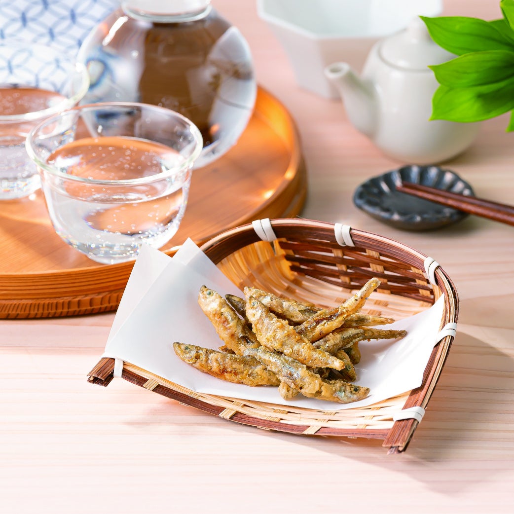 特長:苦みやクセが少ない5~7cmの小さいわかさぎを、職人がからりと丁寧に揚げて、中までサクサクの食感に仕上げました。塩だけで味付けした、素材そのものの味わいをいつでもどこでも楽しめる逸品。