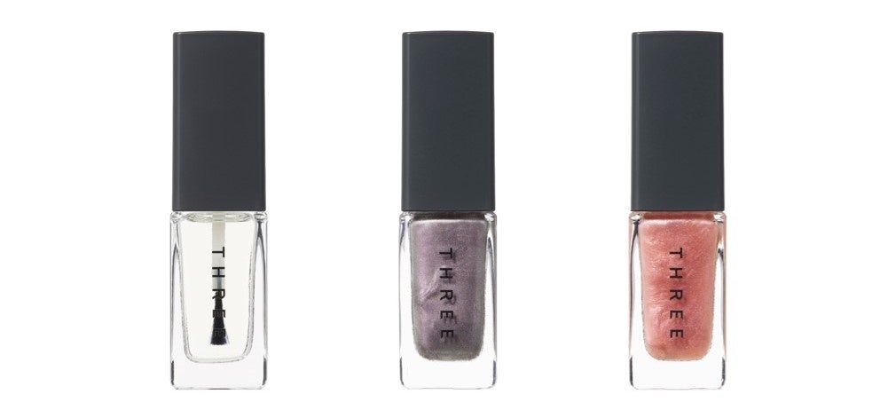 「THREE ネイルラッカー」の質感と色にニュアンスを与え、新たな表情を演出する3種のトップコート。