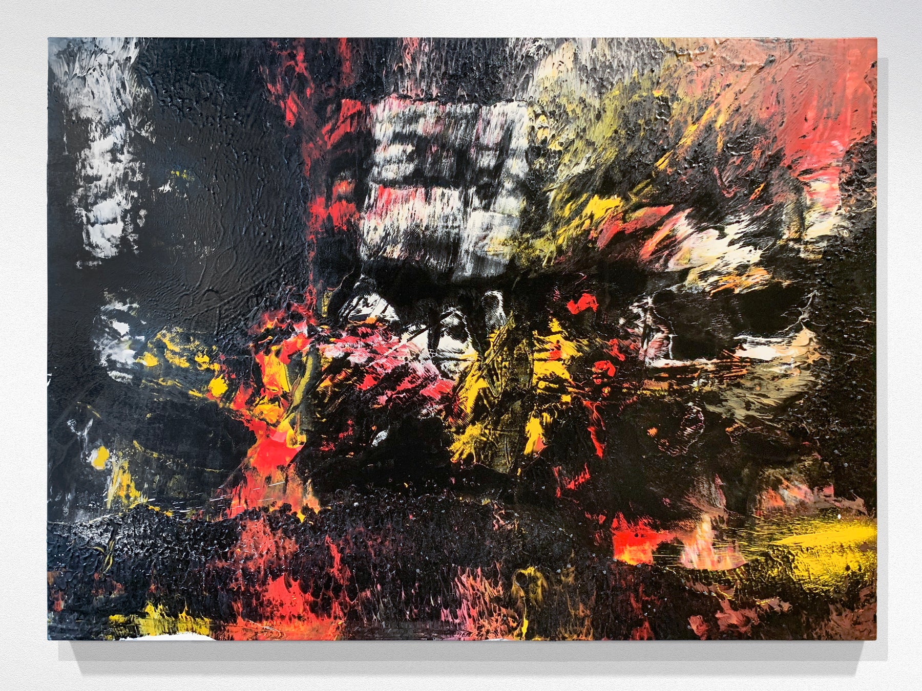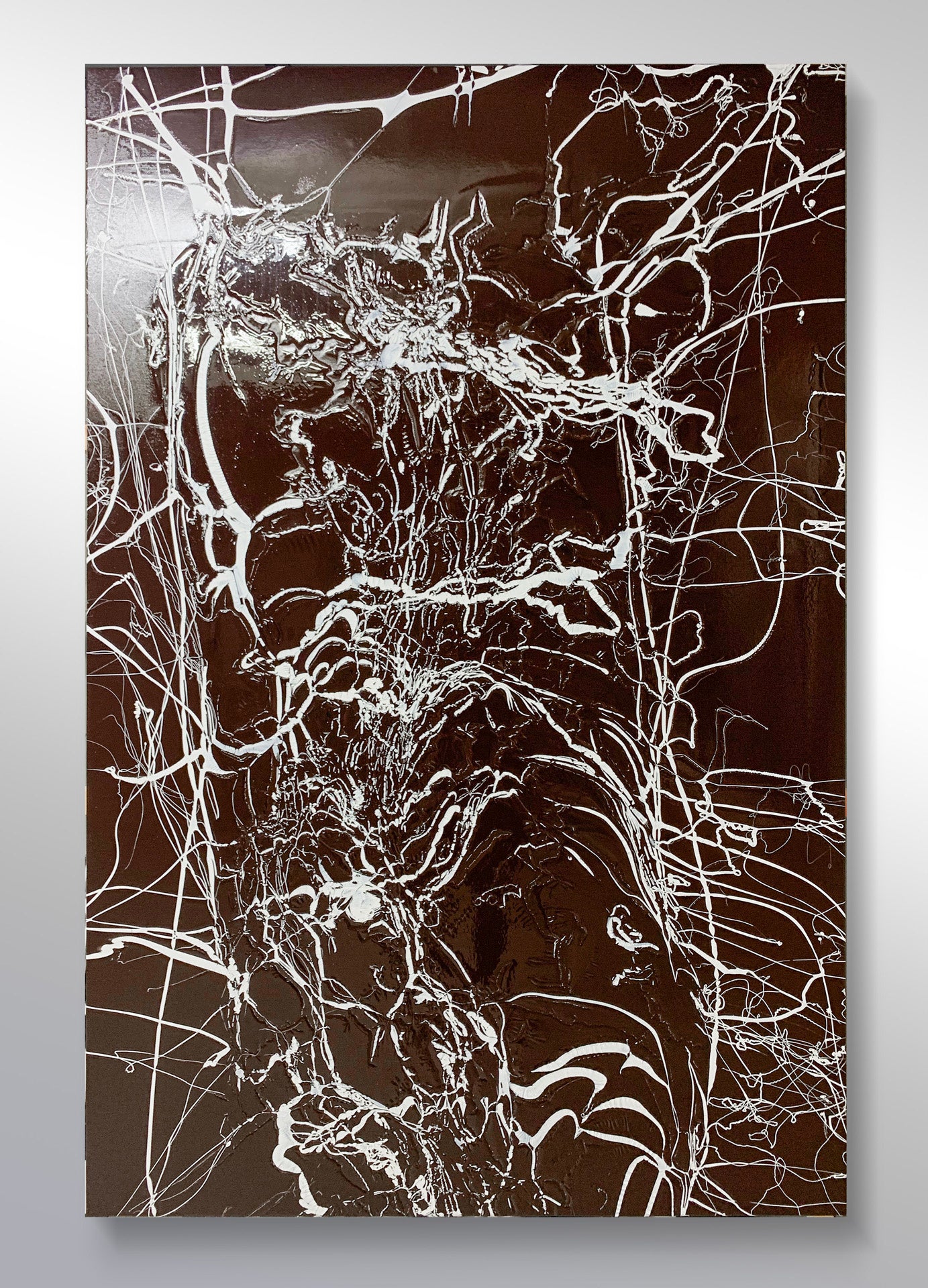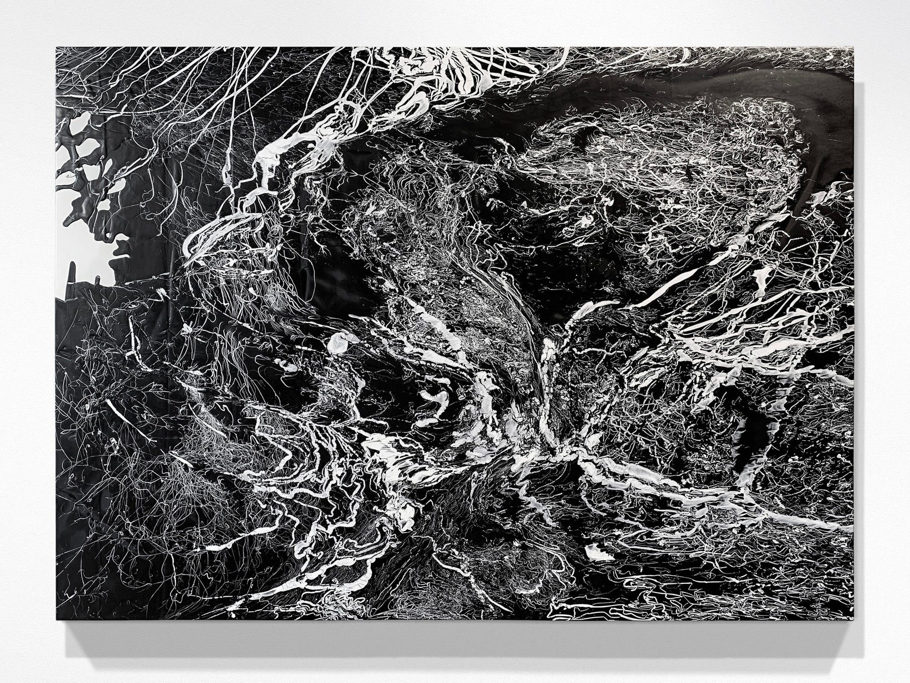 本展で主に展示される『One』シリーズは、一つの行為の反動エネルギーをキャンバスに残そうと試みたシリーズですが、「自由反動」同様、制作する藤元の人的要因が計算できないため、制作前から作品の完成イメージを把握することはできません。それはまた不確実性に満ちた現代社会のメタファーであるとも言えるでしょう。
