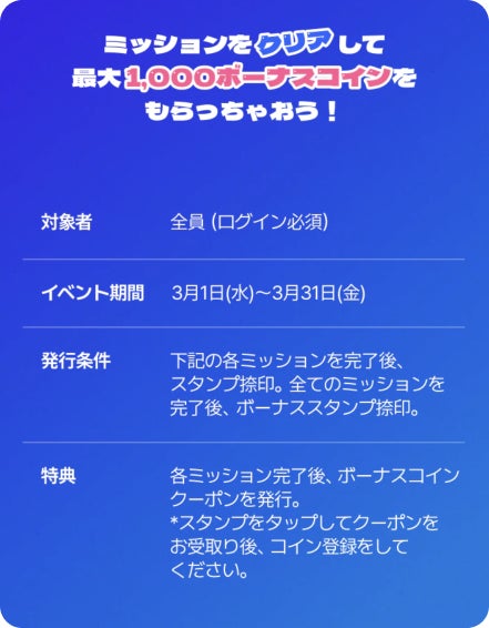 ミッションをクリアして最大1,000ボーナスコインをGET!